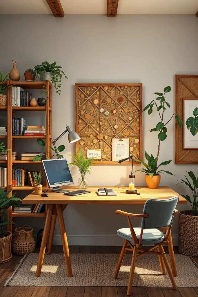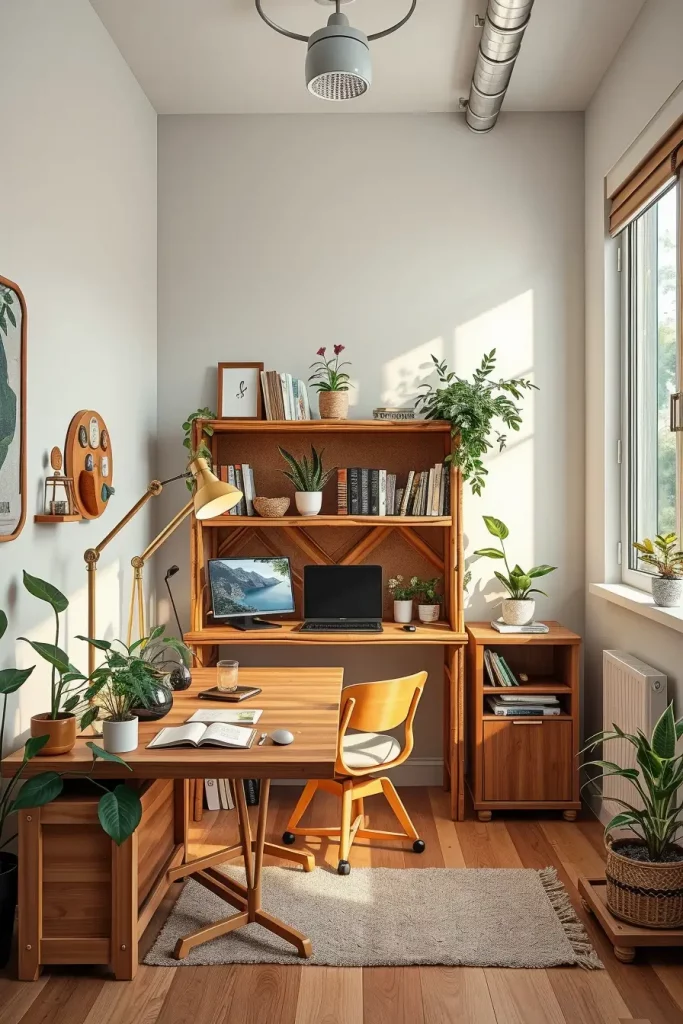 My desk is made of bamboo in my office with a bookshelf made of reclaimed wood. Task lamps that consume less energy are LED and I have also included plants to enhance the quality of air. These touches render the space practical and ensure that I am inspired to continue living an environmentally-friendly life.
