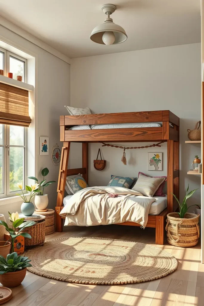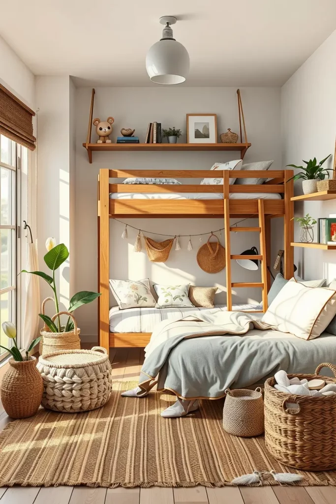 In the case of the most important items in the room, I would choose multifunctional furniture like bunk beds with storage under or modular shelves that can be expanded with the child. It is necessary to use natural cotton or organic linen bedding as it is breathable, safe, and soft. Jute or wool rugs are warm without using synthetic fibers and I like to add storage baskets made of recycled materials as a fun and functional addition.