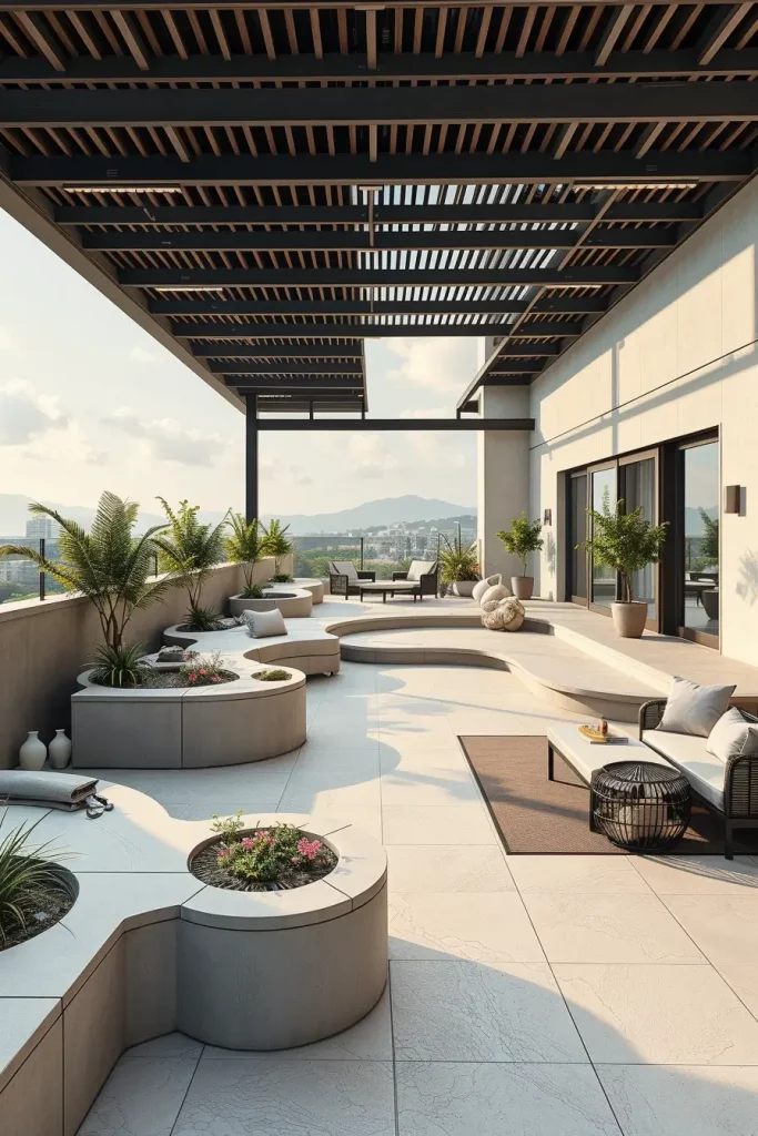 When I design terraces with sculptural seating, I focus on creating forms that serve as both furniture and architectural elements. In Terrace design ideas 2026, seating is no longer an afterthought but a core part of the spatial composition. Curved benches, flowing lounge forms, and integrated seating walls help organize the terrace while maintaining openness and visual continuity.