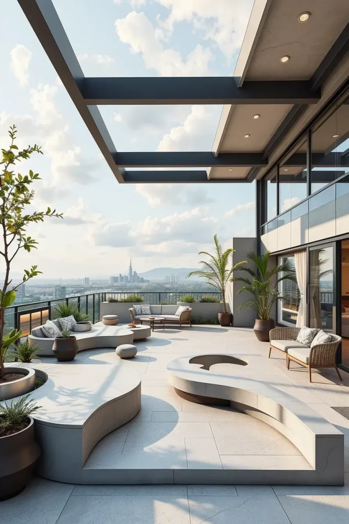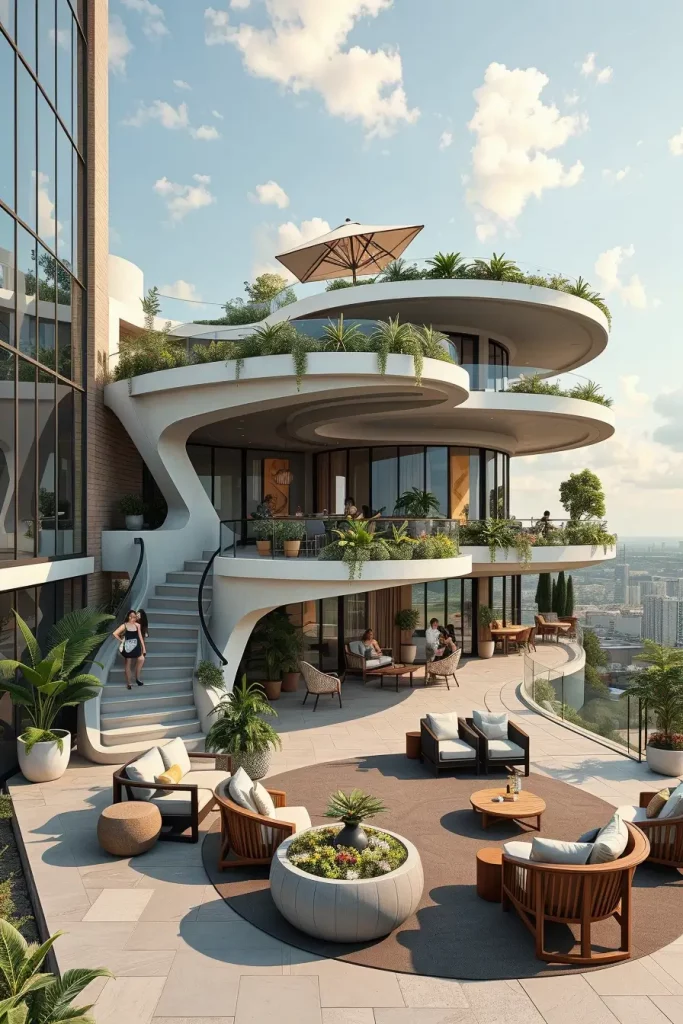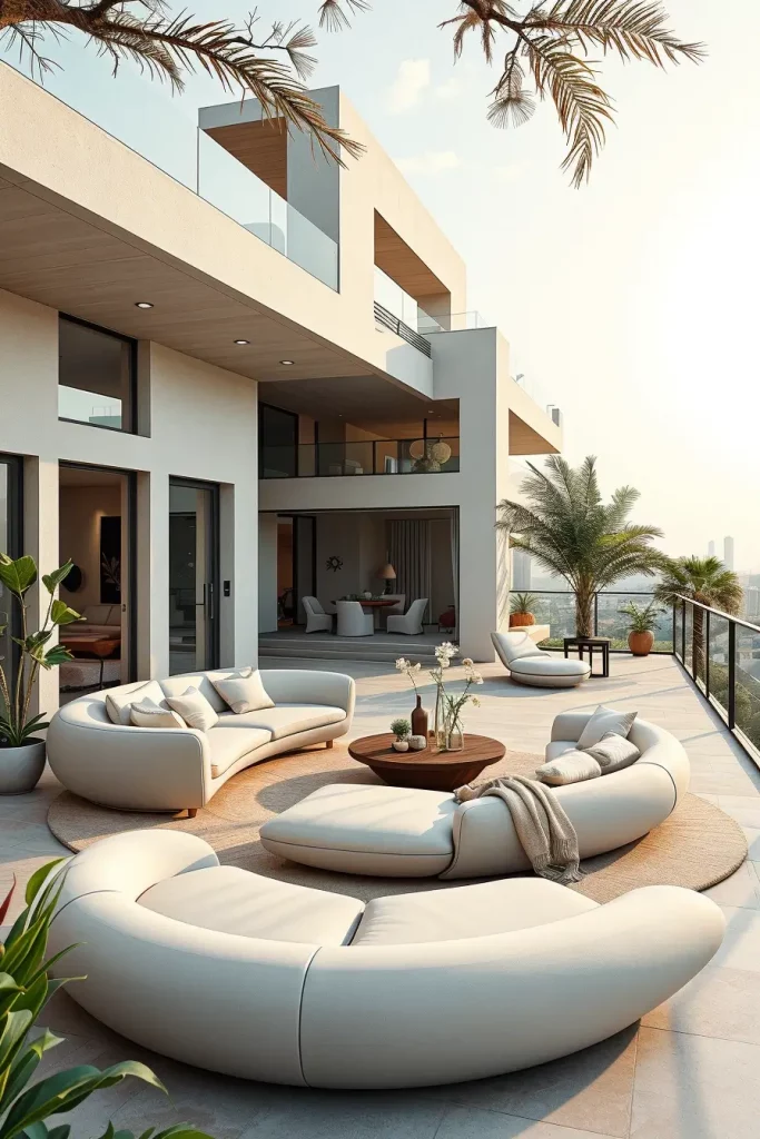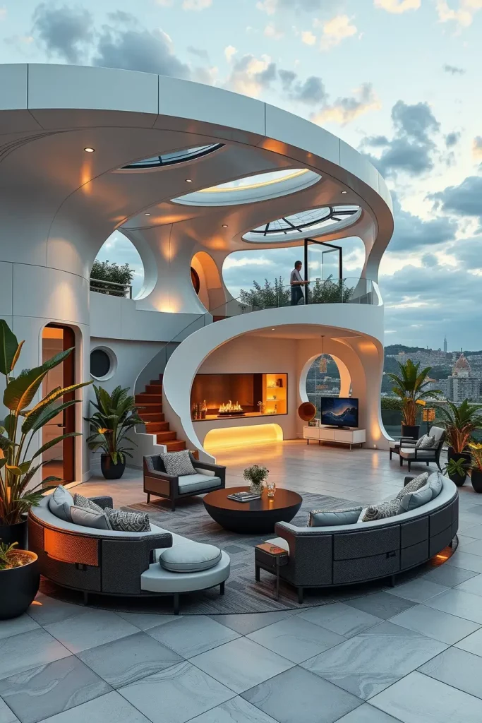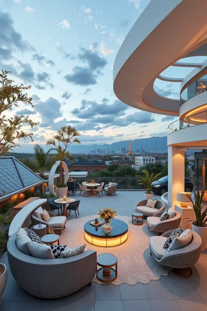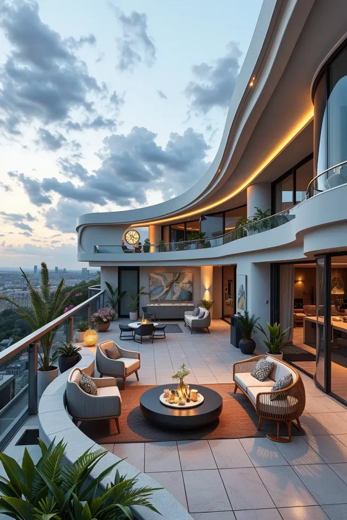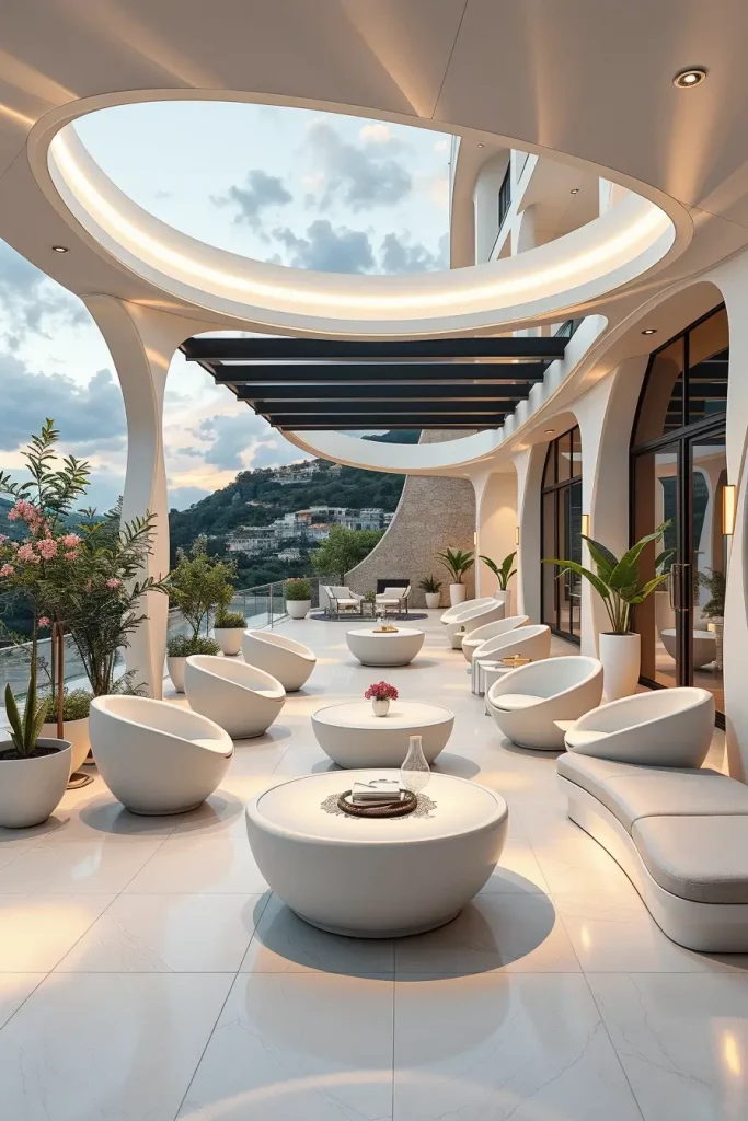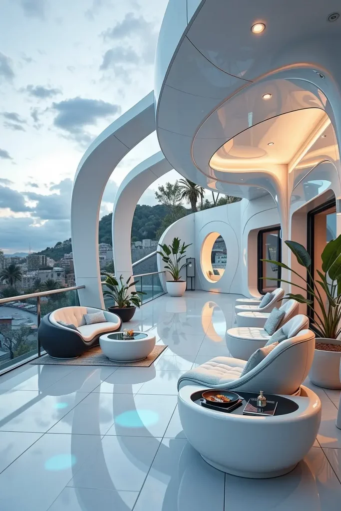 Futuristic terrace designs in 2026 emphasize innovation, comfort, and visual fluidity. I see these terraces as forward-looking spaces that combine advanced materials with human-centered design. Soft curves and smooth surfaces dominate, creating an almost seamless outdoor environment.