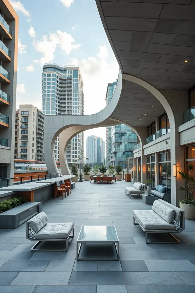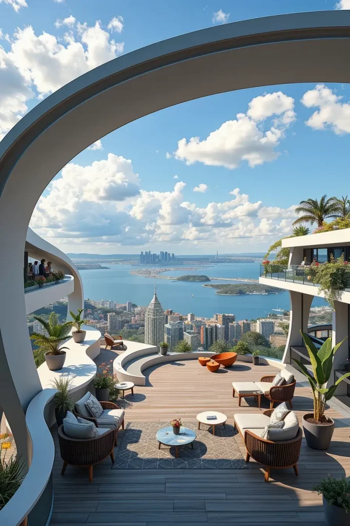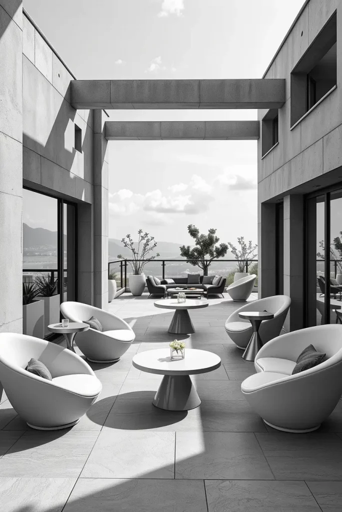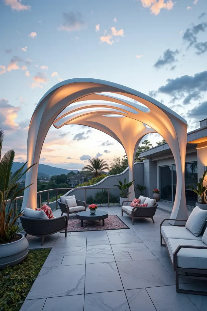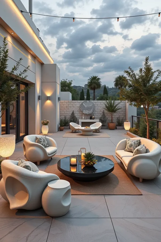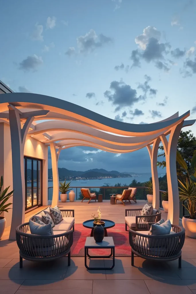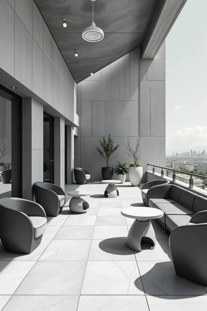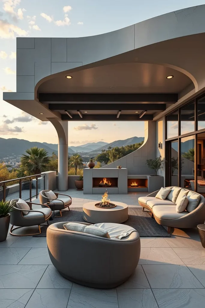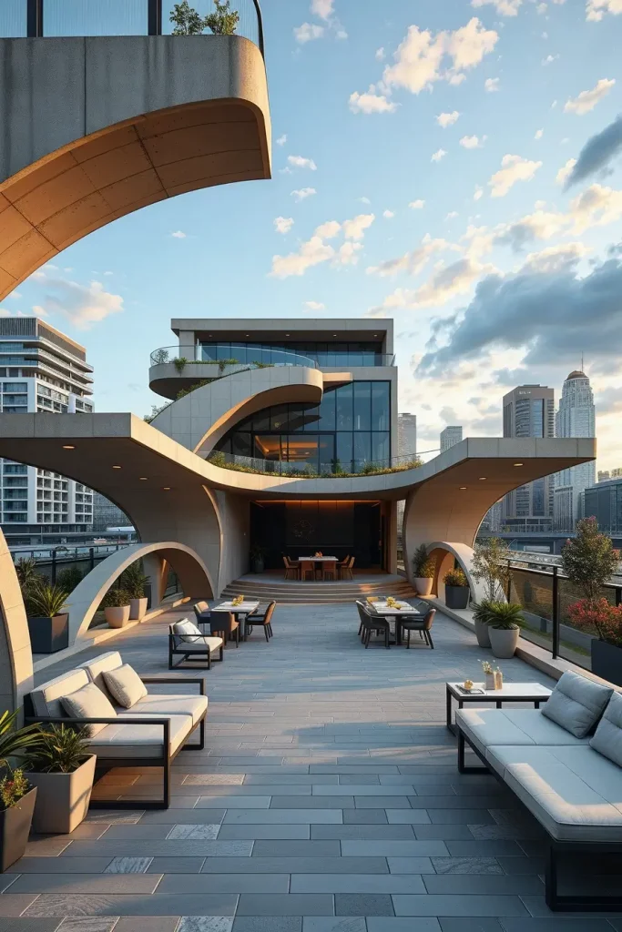 Futuristic terrace designs in 2026 emphasize innovation, comfort, and visual fluidity. I see these terraces as forward-looking spaces that combine advanced materials with human-centered design. Soft curves and smooth surfaces dominate, creating an almost seamless outdoor environment.