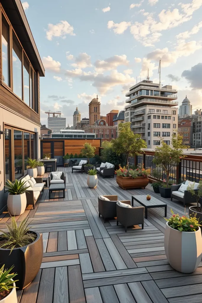 I typically see low-profile furniture, linear benches with rounded corners, and integrated storage solutions in these terraces. Each piece is chosen to minimize visual clutter while maximizing usability. Smooth surfaces, hidden fasteners, and neutral tones help maintain a cohesive look.