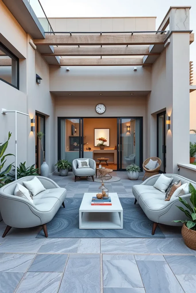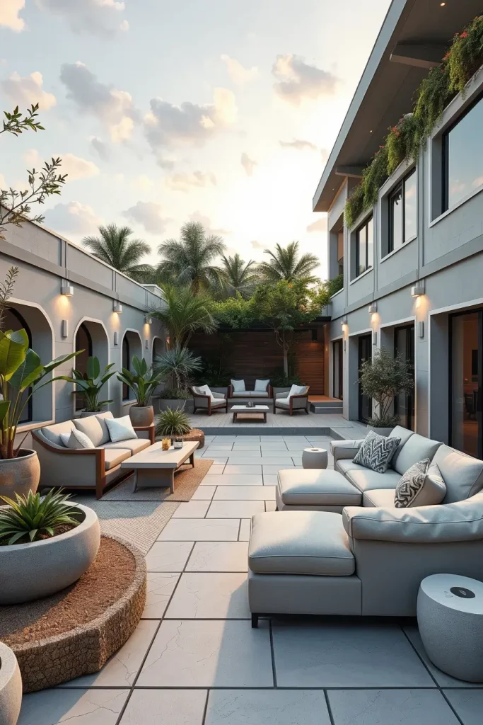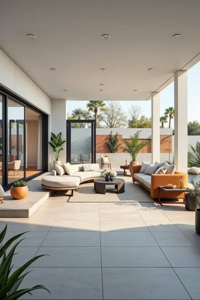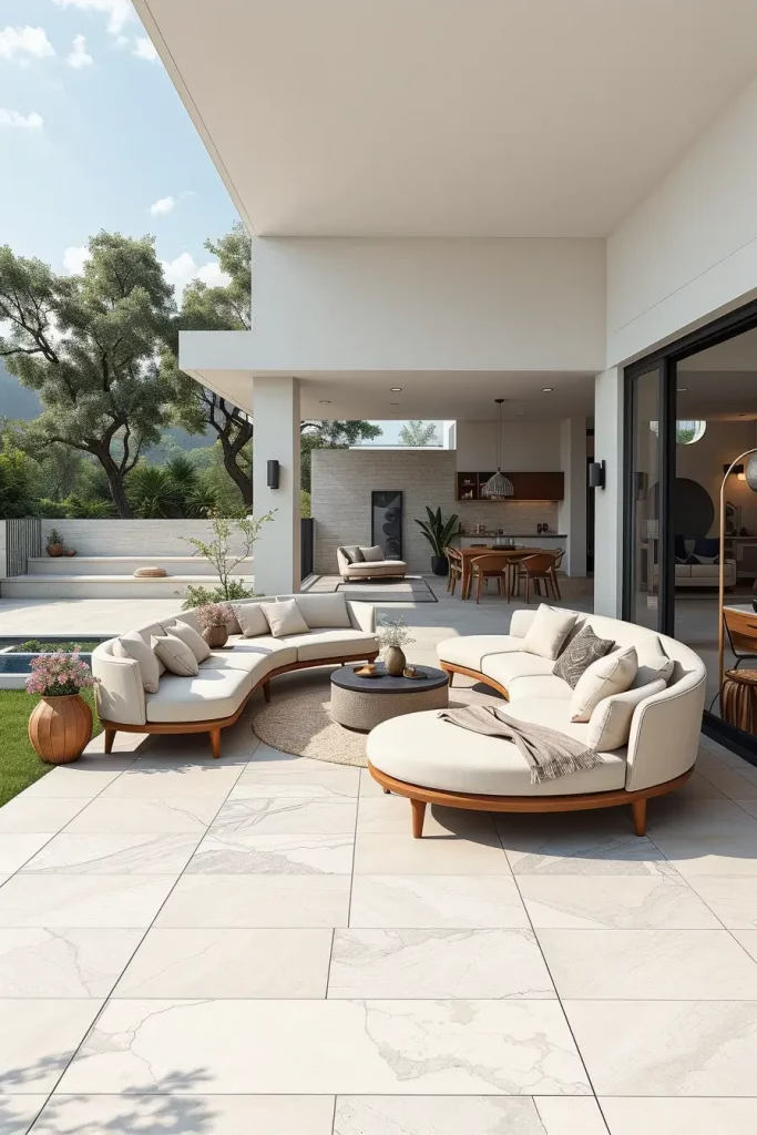 Furniture selection is critical here. I typically use outdoor sofas that mirror indoor silhouettes, curved dining chairs, and streamlined coffee tables that feel familiar yet weather-resistant. Flooring often continues from inside to outside, using large-format tiles or composite decking with soft, organic edges.
