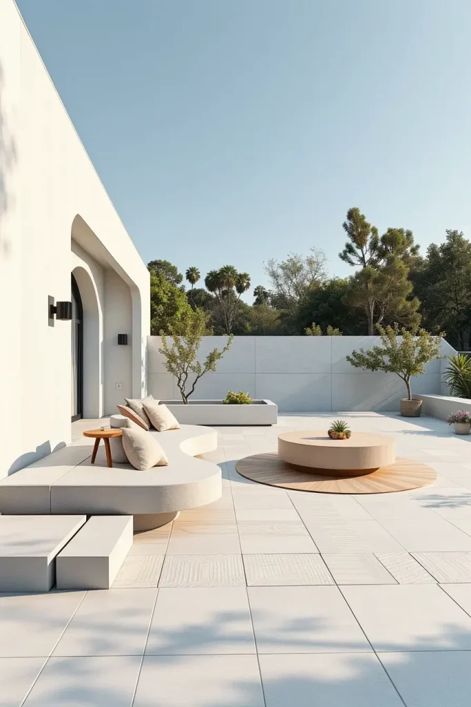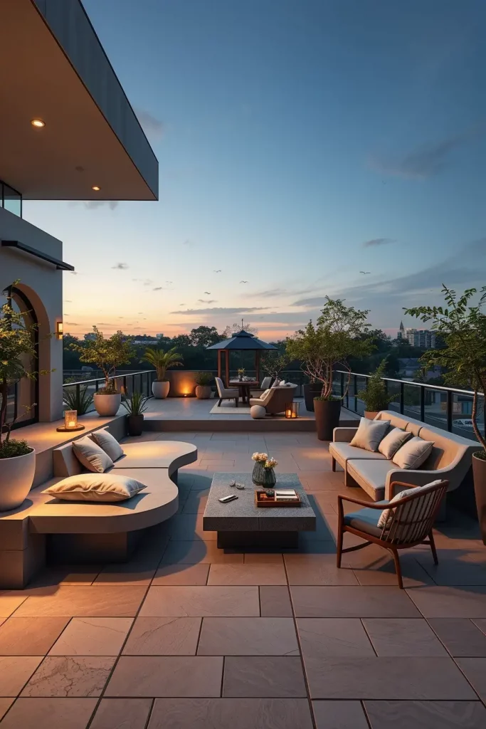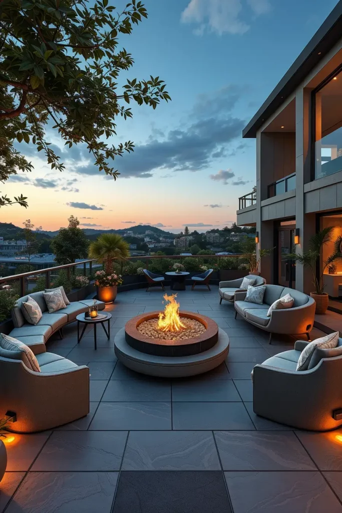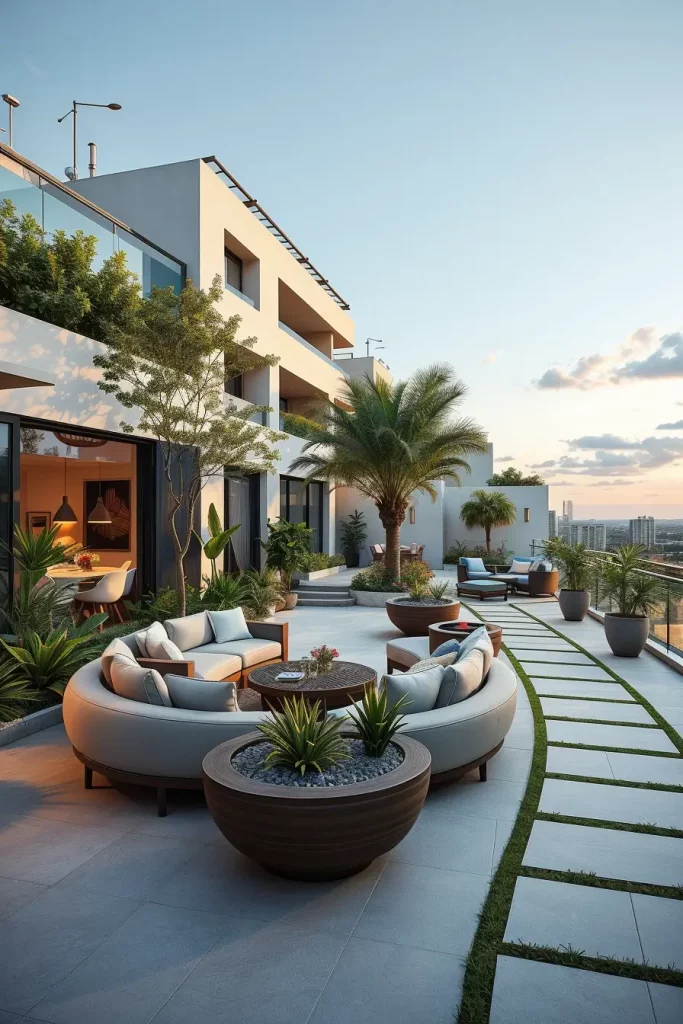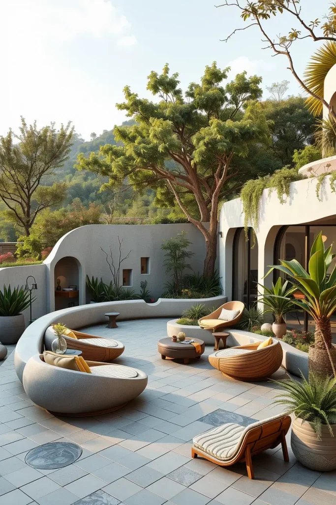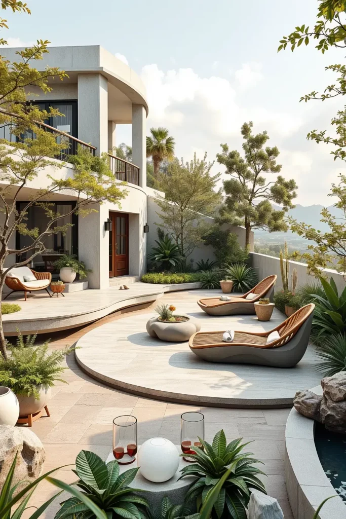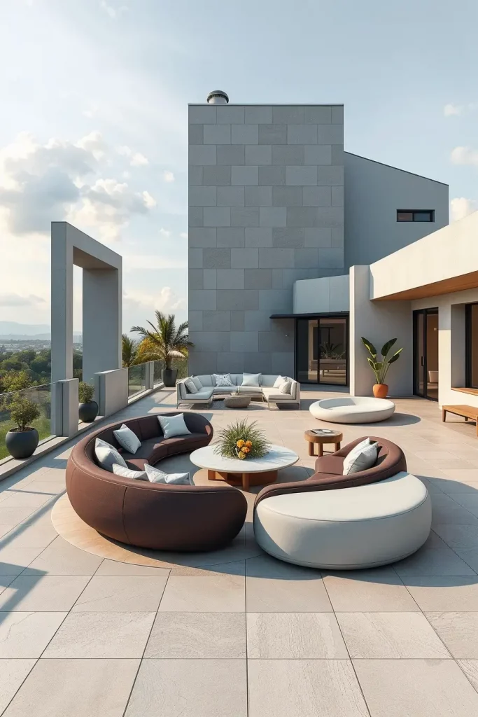 Furniture selection is critical here. I recommend circular dining tables, wraparound benches, and radial seating arrangements that follow the terrace’s geometry. Fire pits or water features placed at the center enhance functionality while reinforcing the shape. Materials should remain consistent to avoid visual fragmentation.