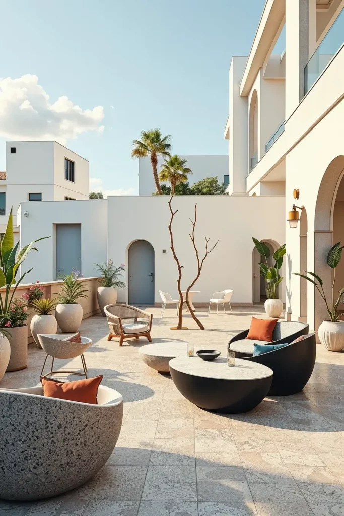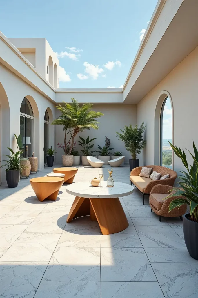 Furniture in these terraces often includes custom curved sofas, asymmetrical lounge chairs, and statement tables with sculpted bases. I select finishes like terrazzo, molded resin, or smooth concrete to reinforce the artistic narrative. Accessories are minimal but intentional, often limited to a few oversized planters or abstract outdoor sculptures.