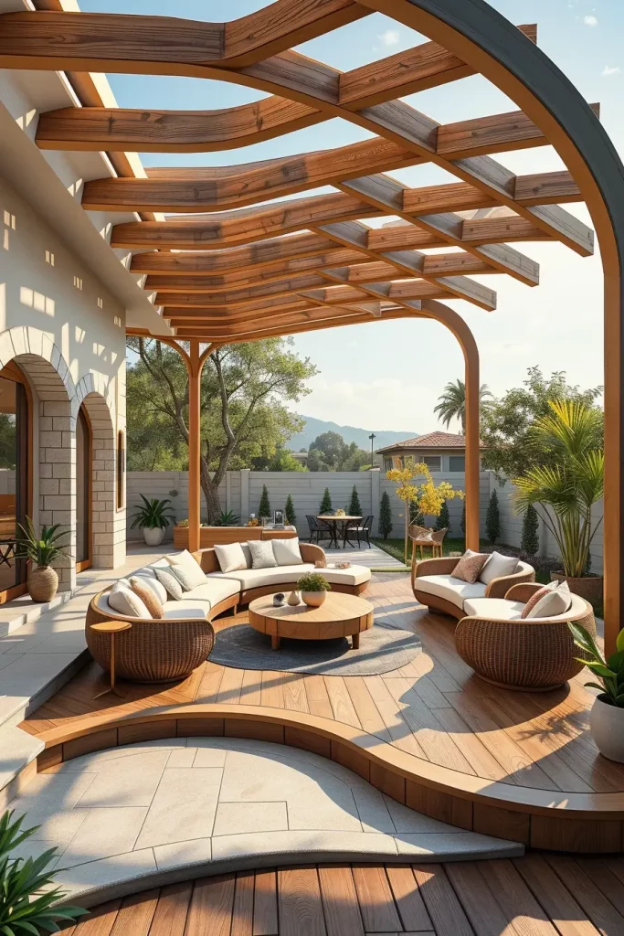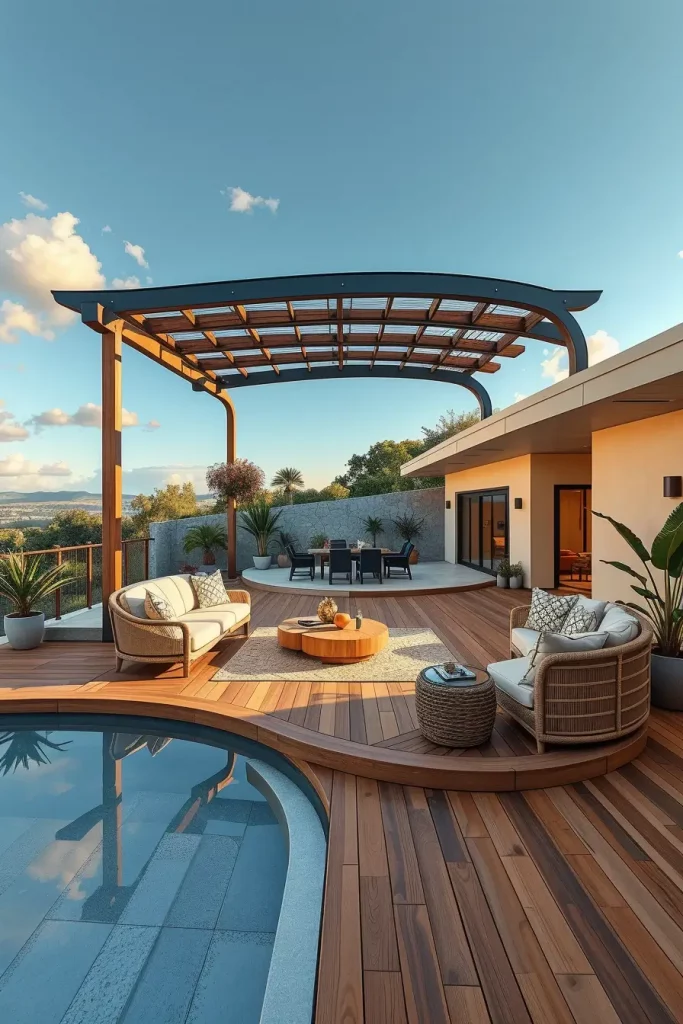 I typically use aluminum, engineered wood, or composite materials shaped into soft curves. Retractable fabric panels, adjustable louvers, or integrated greenery provide shade without heaviness. These pergolas often serve as focal points, anchoring dining or lounge areas visually and functionally.