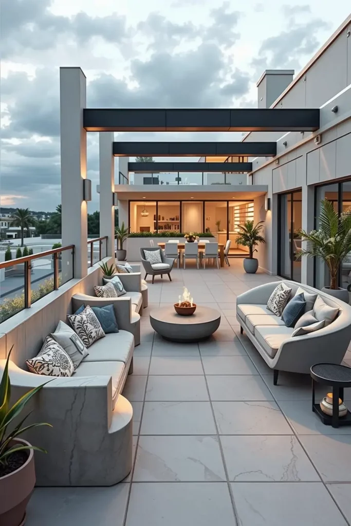 Furniture selection is critical here. I rely on built-in curved seating, streamlined outdoor kitchens, and custom lighting structures. These elements are included because they maximize usable space while reinforcing the terrace as a designed architectural feature rather than an afterthought.