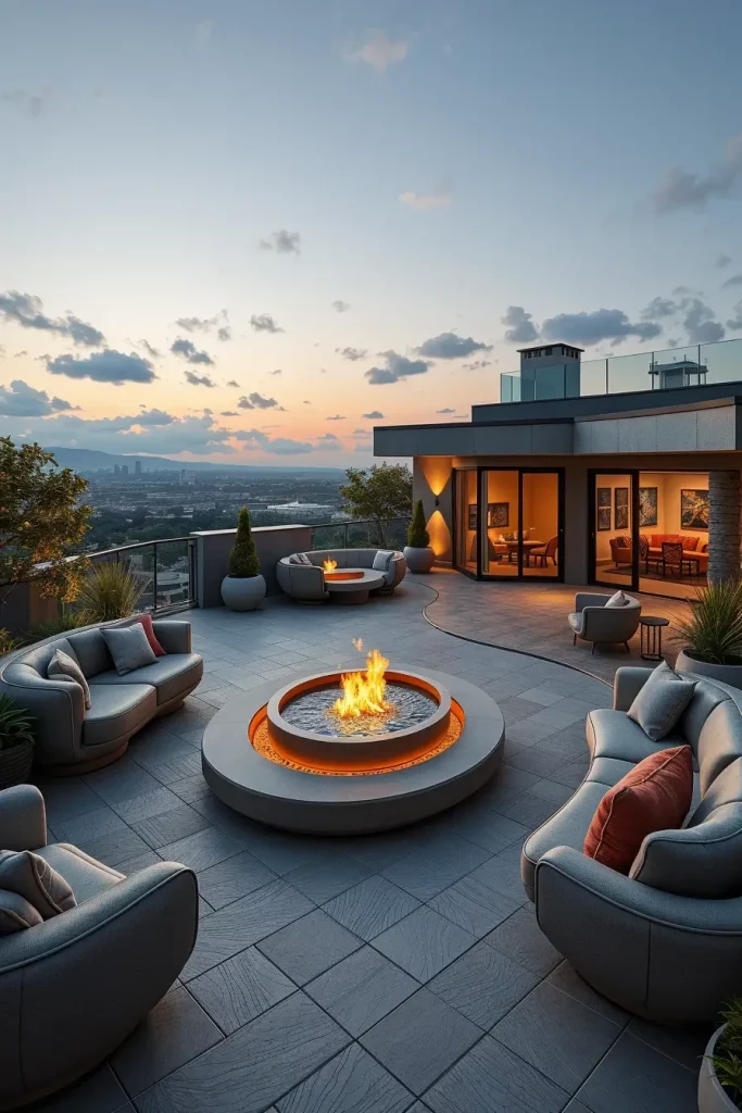 I see terraces with curved fire and water features as one of the most expressive directions in terrace design ideas 2026. These spaces are built around balance and movement, where fire pits, water basins, and soft architectural lines create a calm yet dramatic atmosphere. From a practical point of view, curved elements guide circulation naturally and make the terrace feel cohesive rather than fragmented.
