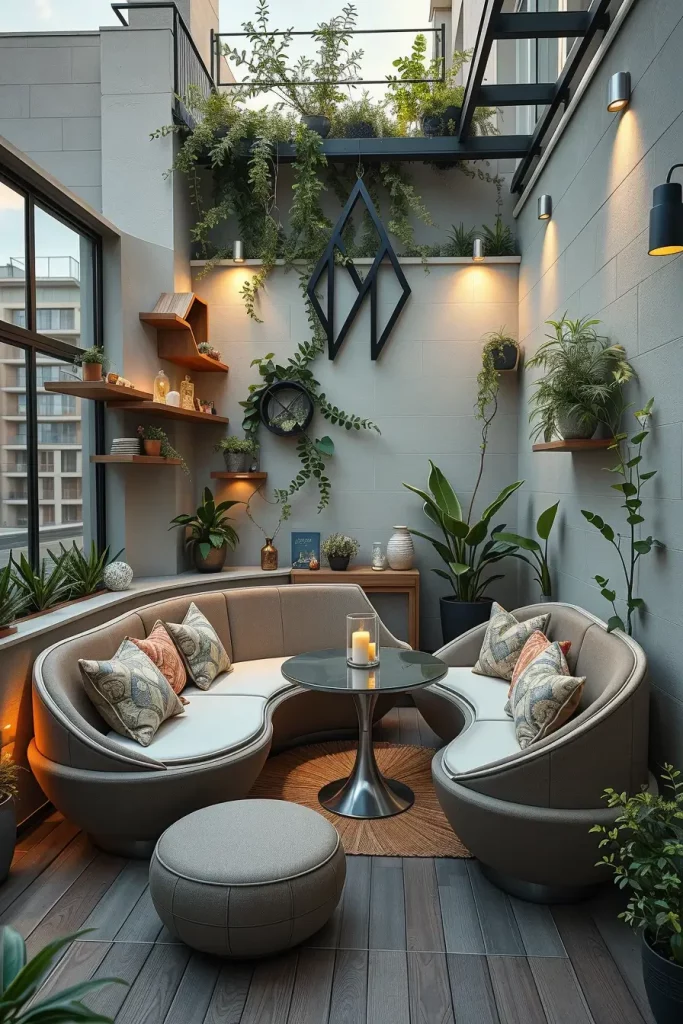 I often design custom curved benches with hidden storage, oval tables, and wall-mounted sculptural shelves. These pieces are included because they save space while adding a strong design statement, which is essential in small terraces.