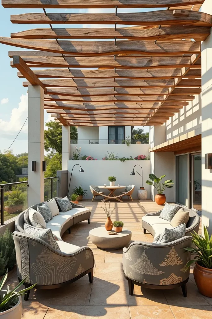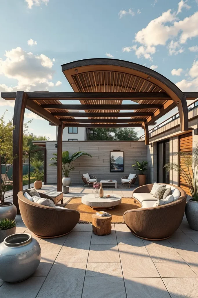 Pergolas and canopies in Terrace design ideas 2026 evolve into sculptural structures that define space while offering comfort. I design these elements as architectural forms with curved beams, oval frames, or flowing silhouettes that echo the terrace’s overall design language.