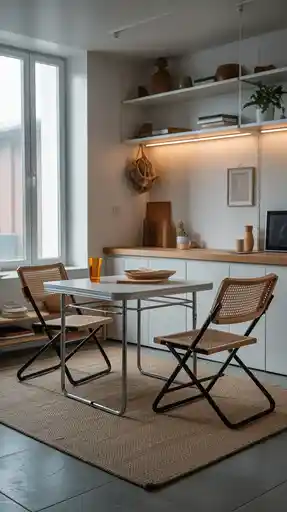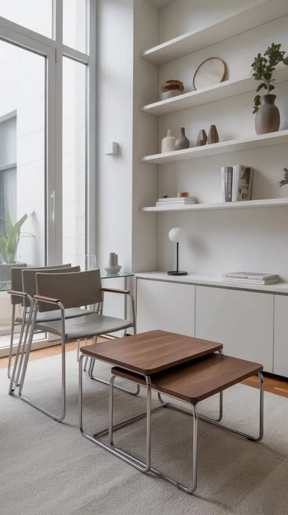 These seats are commonly made of such materials as aluminum, hollow frame wood or high-tech polymers. I prefer open-backed designs, slim-legged ones and compact ones because open backs, slim legs and compact designs ensure that the room remains light and functional. Together with them, I would include a mobile bar cart, versatile shelves, or foldable ornaments to create a unified lightweight look.