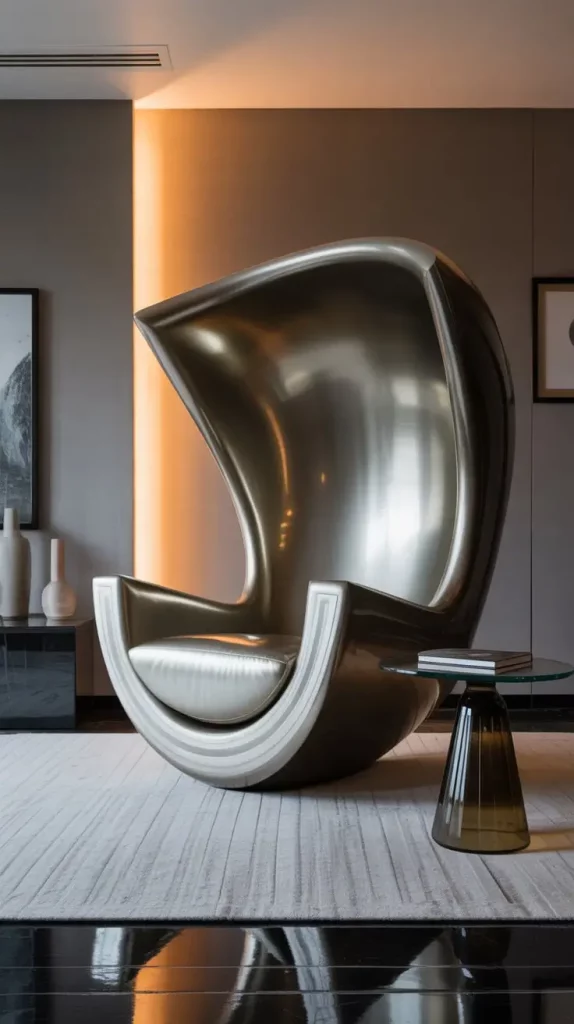 In this kind of chair, I would select material such as funky wood lacquered, metal molded or upholstery of designer quality. They are sometimes exaggerated in shape and asymmetrical or angular in their lines and thus they are visually arresting. I would match them with minimal accompanying items like glasses coffee table or minimalistic lighting to maintain the cohesion of space.