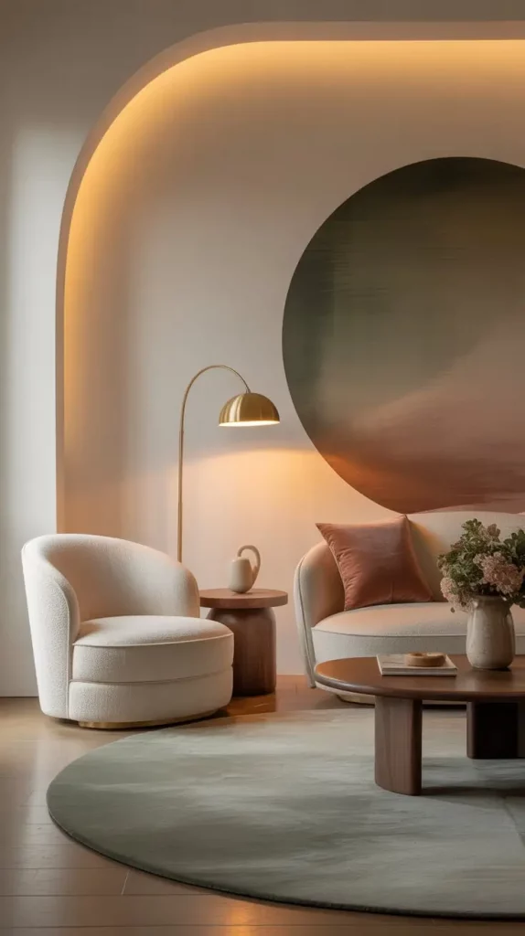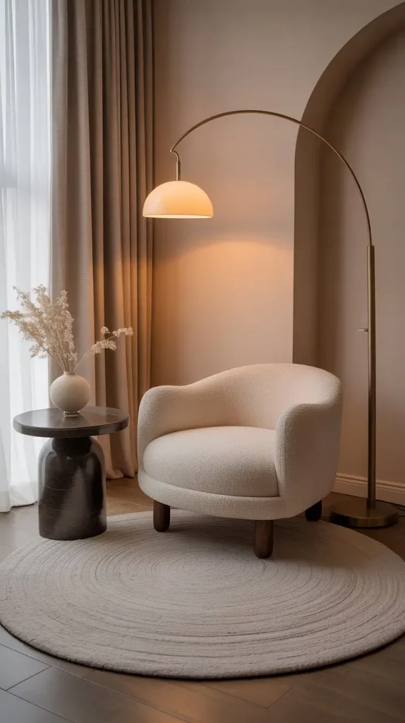 I tend to choose furniture that contains oversized cushion lounge chairs, soft boucle or wool-blend upholstery, supportive armrests, etc. I also prefer to use rounded silhouettes as they help to make the room look softer and calming in its appearance. Combining these chairs with warm lamps, multiple carpeting, or a close table would make a whole relaxation area.