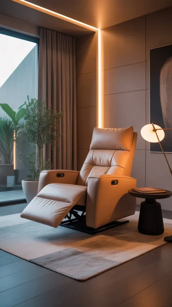 The most comfortable recliners are those with adjustable headrests, ergonomic support, and those with inbuilt amenities such as USB ports. I combine them with soft side lighting, small side-tables and warm carpets to make them have the designated relaxation zone. The accurately combined texture and colors can be used to bring the entire design and make the recliner look part of the whole and not a separate piece.