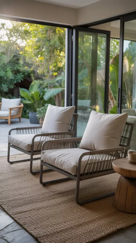 I consider the choice of design elements and use pieces with powder coated aluminum frames, resin wicker, performance upholstery and lightly sculped silhouettes which make people more comfortable. I also add side tables, cushions of neutral tones and textured carpets and light wooden decorations to ensure that the hybrid interior does not look disjointed. The necessity of these elements lies in the fact that they bring the feeling of coziness inside, at the same time staying resistant to weather conditions outside and do it sufficiently flexibly, without imposing on the style.