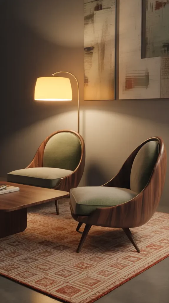 To create the desired ambience, I would store these chairs as a set of brass floor lamps, low wooden coffee tables, patterned vintage rugs and a wall art that is textured and shows employer in craftsmanship. Such combination of materials makes the room rather characterful and deep but not too themed. These chairs are also more adaptable to the modern environment, as they have soft boucle fabric, smooth leather finishes, and warm walnut accents.