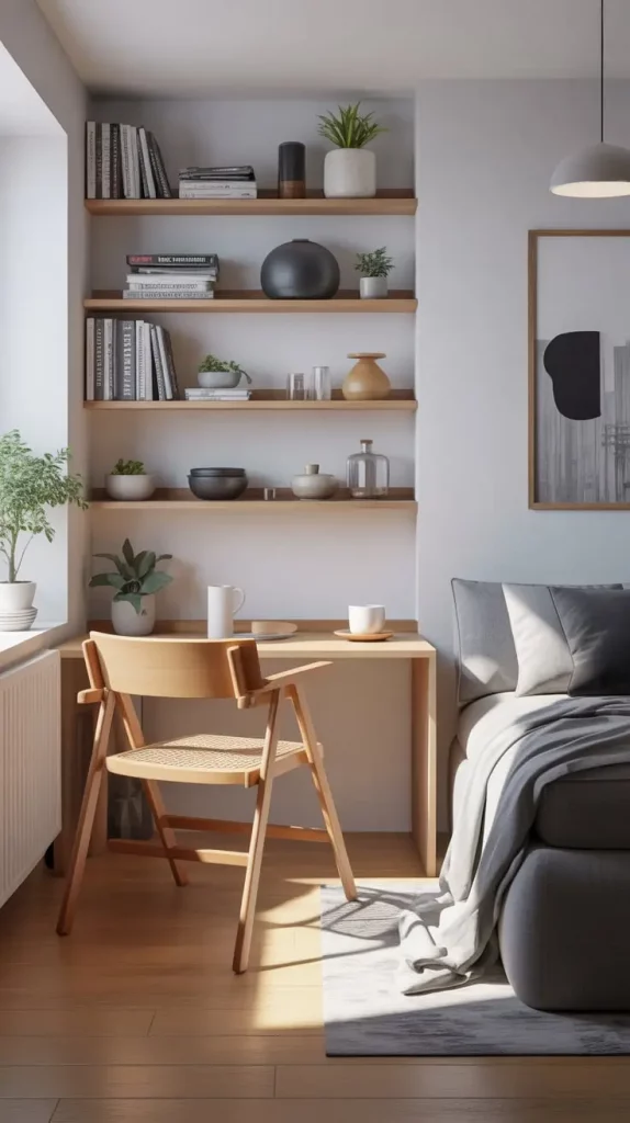 In the event of filling out such a space, I would possibly include wall shelves or compact storage units that would be in harmony with the space-saving plan and at the same time would not disturb the visual balance.
