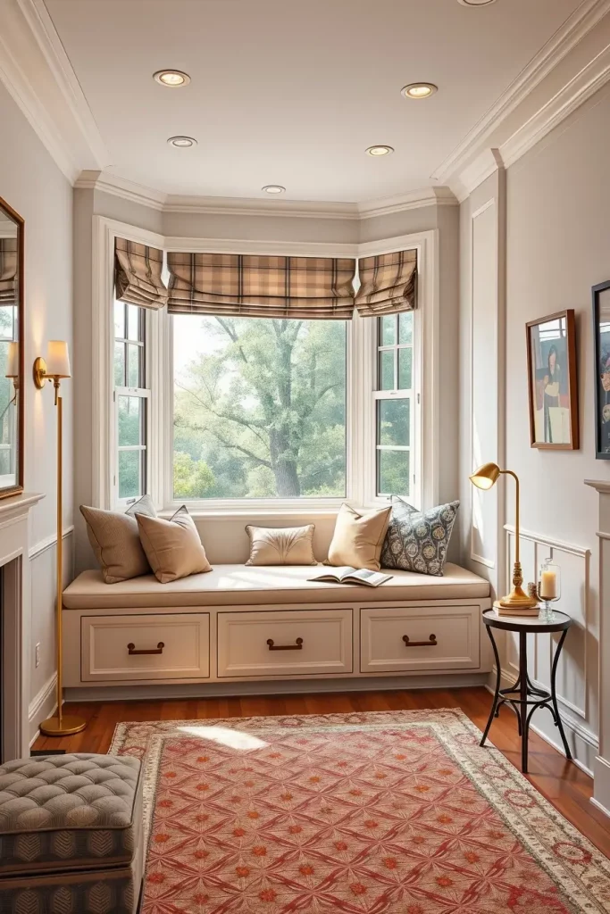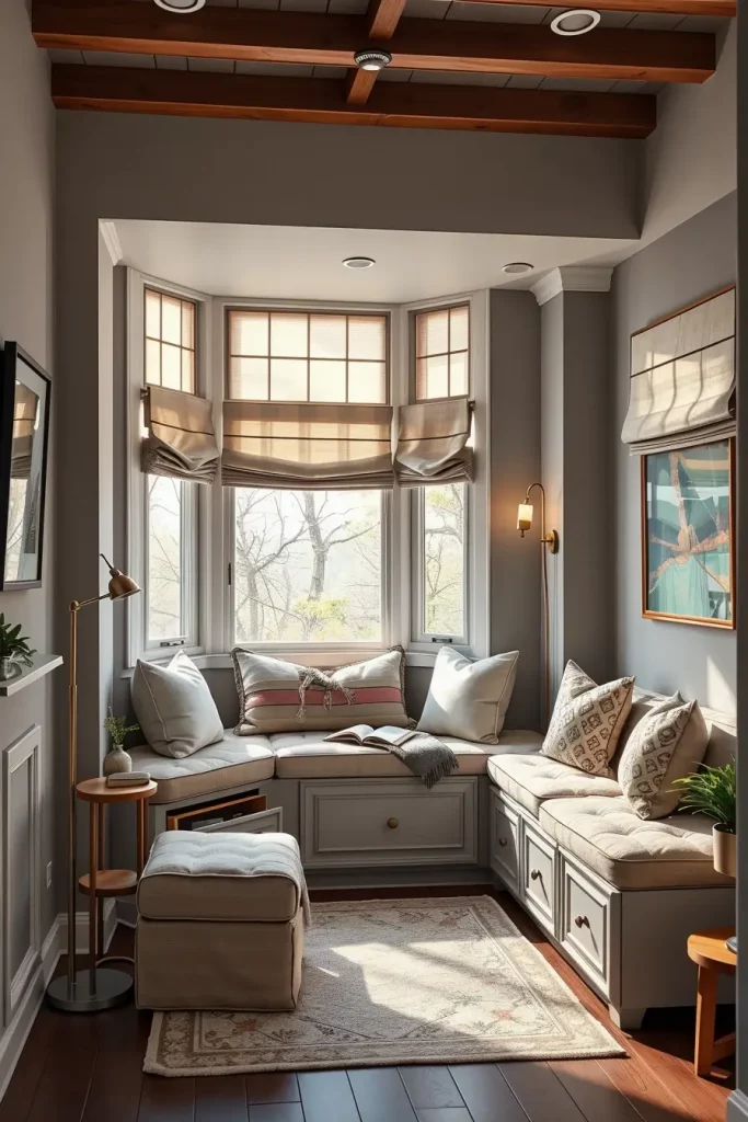 A custom bench seat with built-in drawers underneath the window area is what I have created. Add some comfort to your seating by including cushions and many pillows and finish it with drapes or Roman shades. Having space for a narrow side table helps this become an excellent area to read.