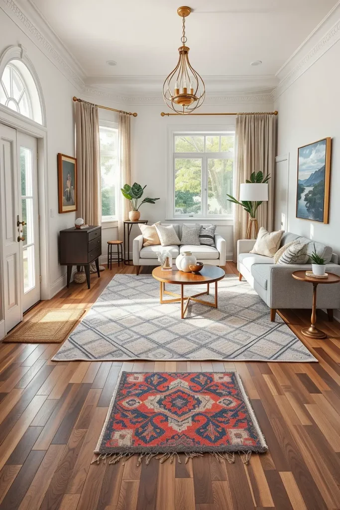 Find a rug that is big enough to reach just below the front legs on your sofa and matching chairs. In rooms without walls, place diverse rugs in each area to indicate what’s where. If your space is minimal, a soft-pattern rug will fit the theme, but if you like eclectic styles, choose one with bold patterns.