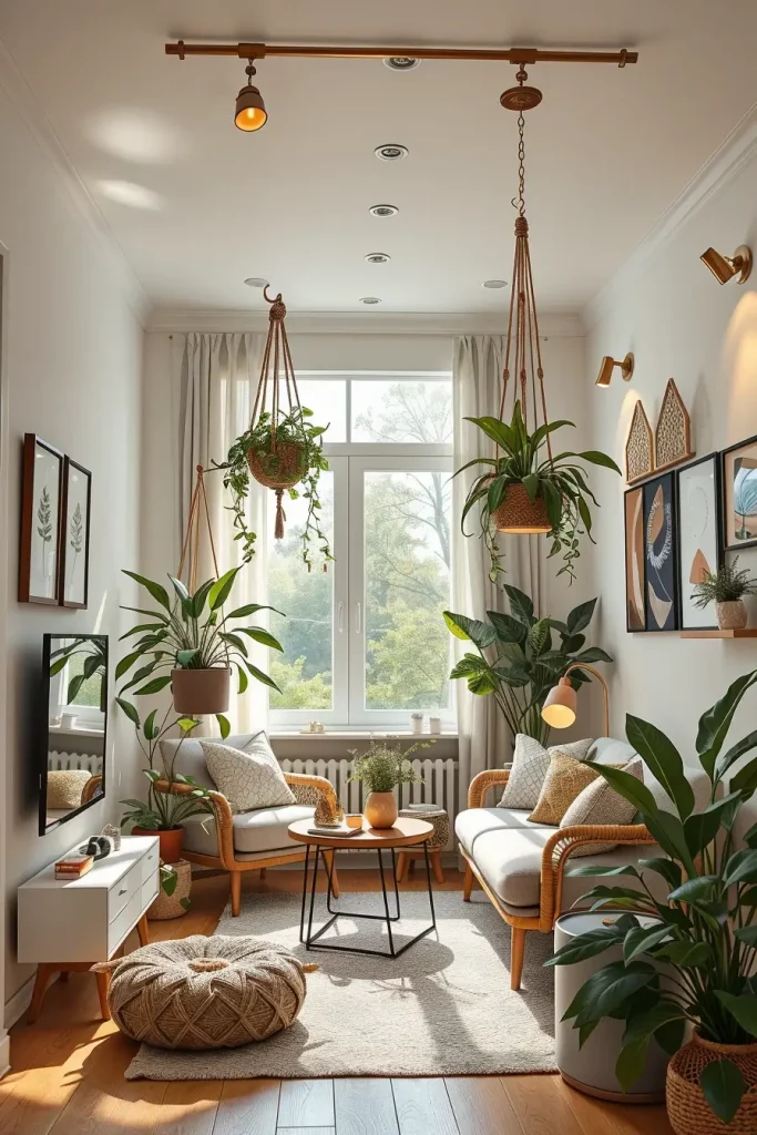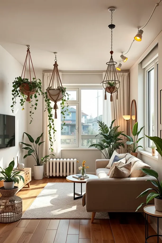 One easy and effective suggestion for a small living space is to put up hanging plants. Where floorspace is limited, using vertical design is very important. With planters hanging from the ceiling, the beauty and action they add remains in the room and doesn’t take up floor or surface space.