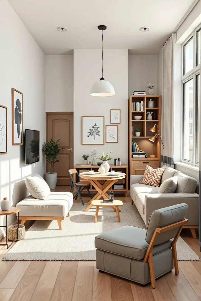 I like adding things like folding desks, extendable coffee tables or benches that can be used as cubes for storage. When you are low on space, a Murphy chair or a folding table can be used for dining, so the living room can double as the dining room.