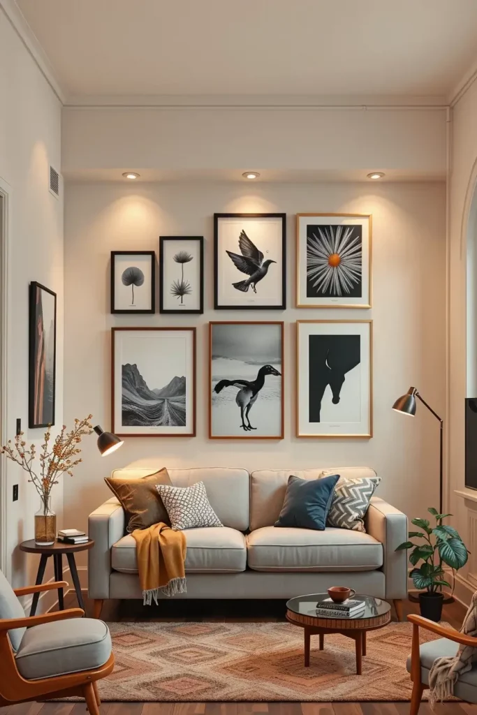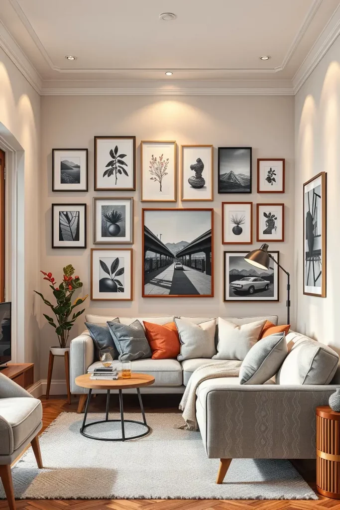 Gallery walls are a fun way to add your own touch to your small living room. A unique wall design can be the central focus which means you do not need plenty of large furniture or artwork, so it fits nicely in small spaces.