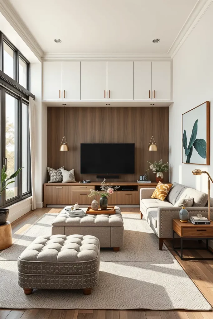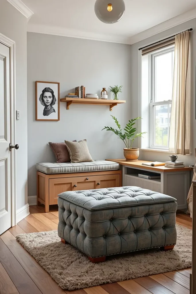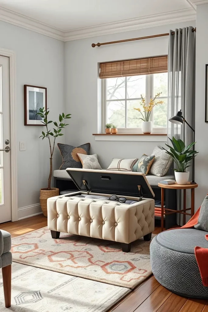 Placing storage ottomans and benches is a clever way to use space in a small living room. Because of their folding abilities, these pieces add storage space and also act as seating or tables which is perfect for small spaces.