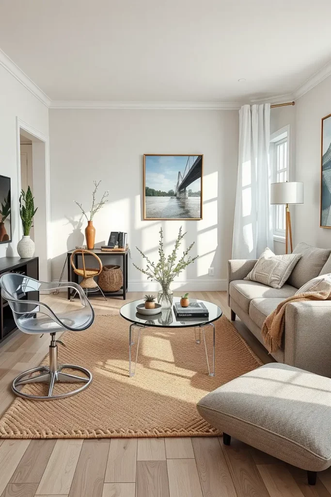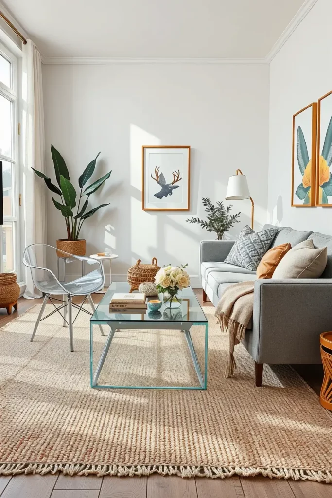 Adding furniture made from acrylic or glass can open up and lighten your creative small living room. These pieces give you everything you need for your cupboard while letting sunlight come through which helps make your room feel more spacious.