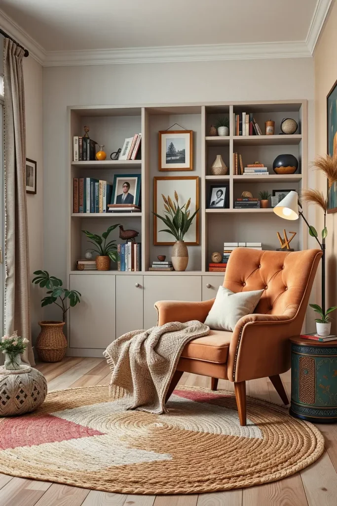 A method I rely on is adding various types of textures to a surface. Having a boucle cushion on a velvet chair, plus a jute rug, gives the space a friendly touch. A floating shelf, used to showcase personal trinkets in small groups, works well also. Decide on colors that express that mood you have—softer tones for peace, stronger colors for passion or life.