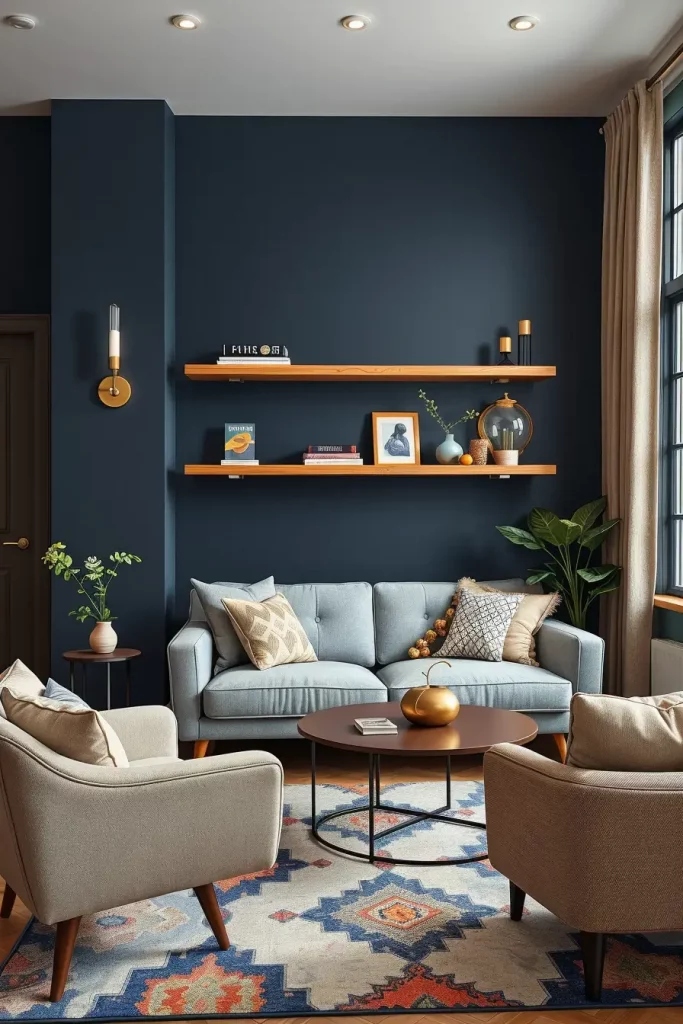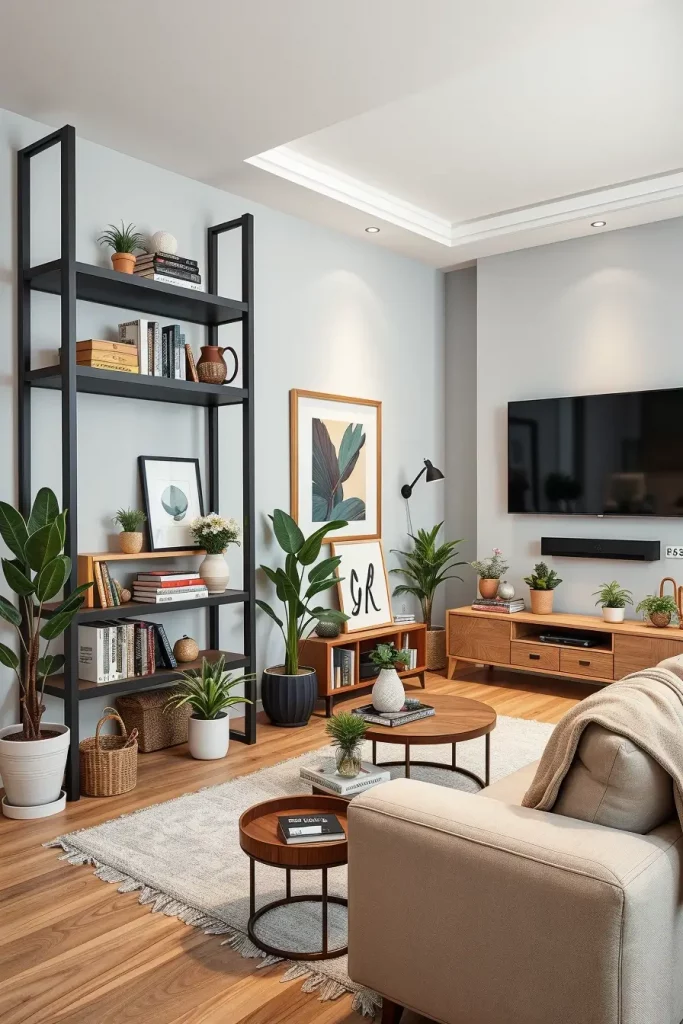 Many of my designs include stacked floating shelves installed on a single accent wall, so homeowners can change how they use them as time goes on. For a Scandinavian room, use hanging shelves in light oak, while a minimalist room might work best with flat black shelves. A corner spot can still work if it’s set up in the right way.