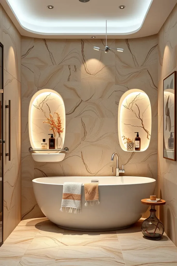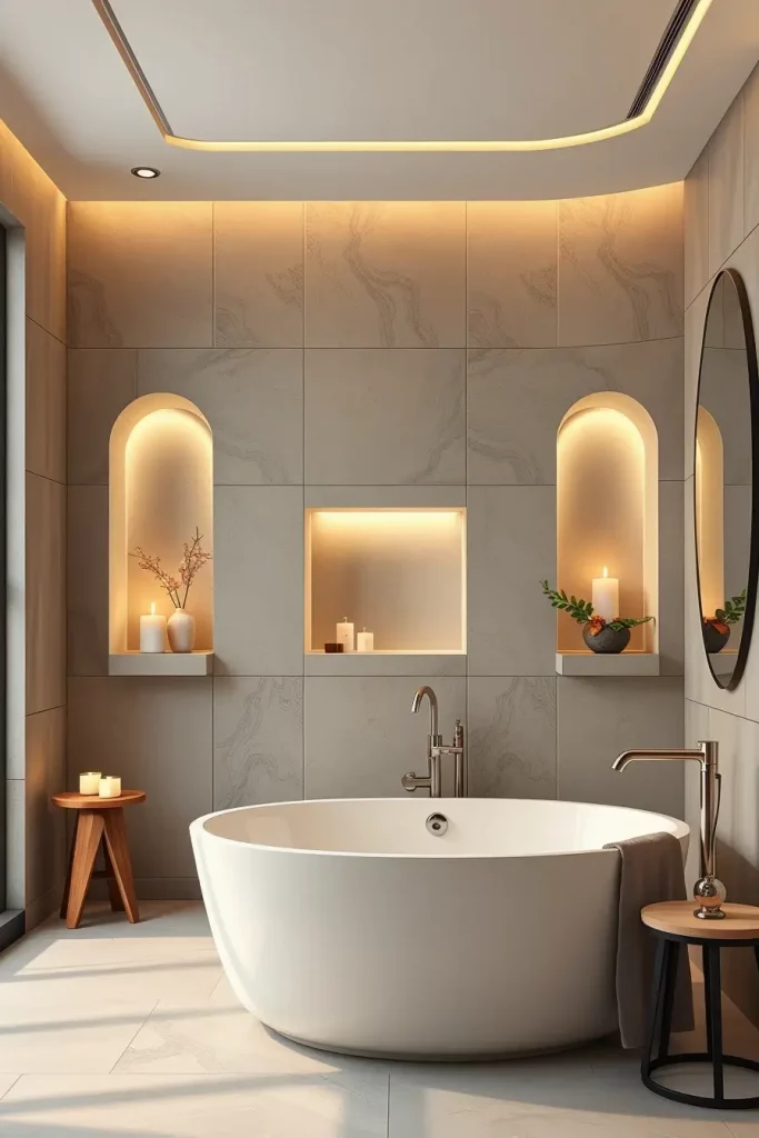 I would frame these niches in stone or smooth matte tile because I like to highlight the curve. A secret wire LED strip down under the curve might give depth and mood. When you are placing one of them above the bathtub or in the area of the shower, this kind of a built-in storage will reduce cluttering and demonstrate a devotion to the elegant design of the interior.