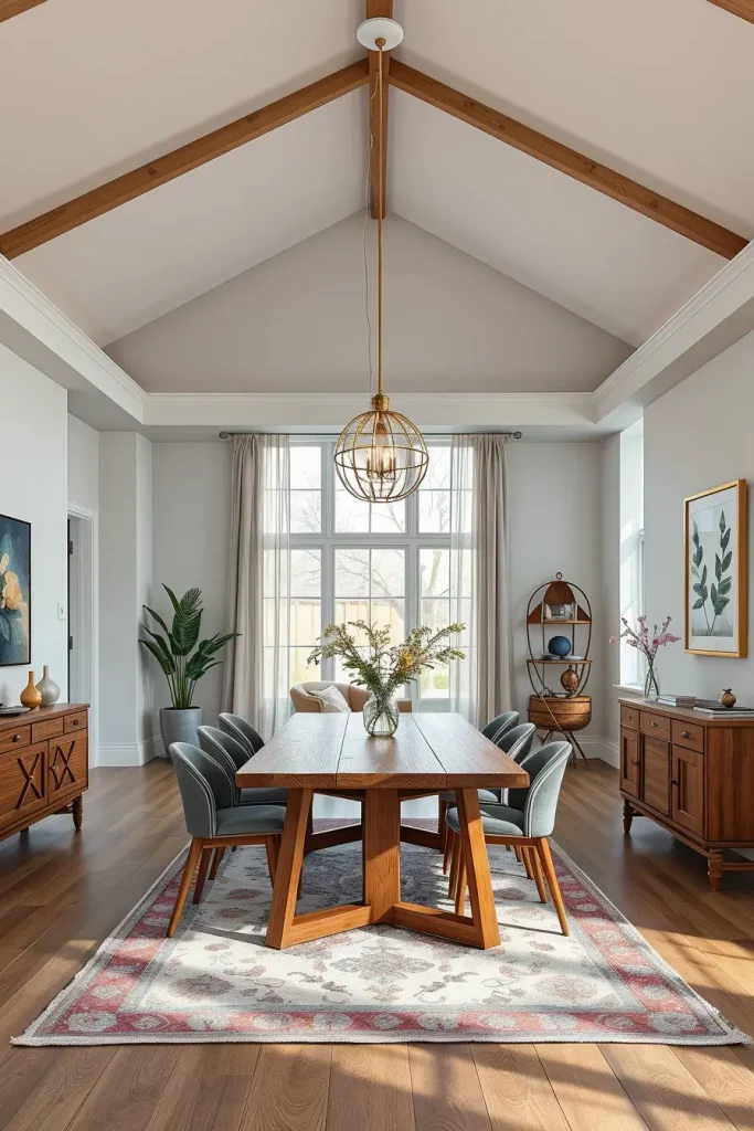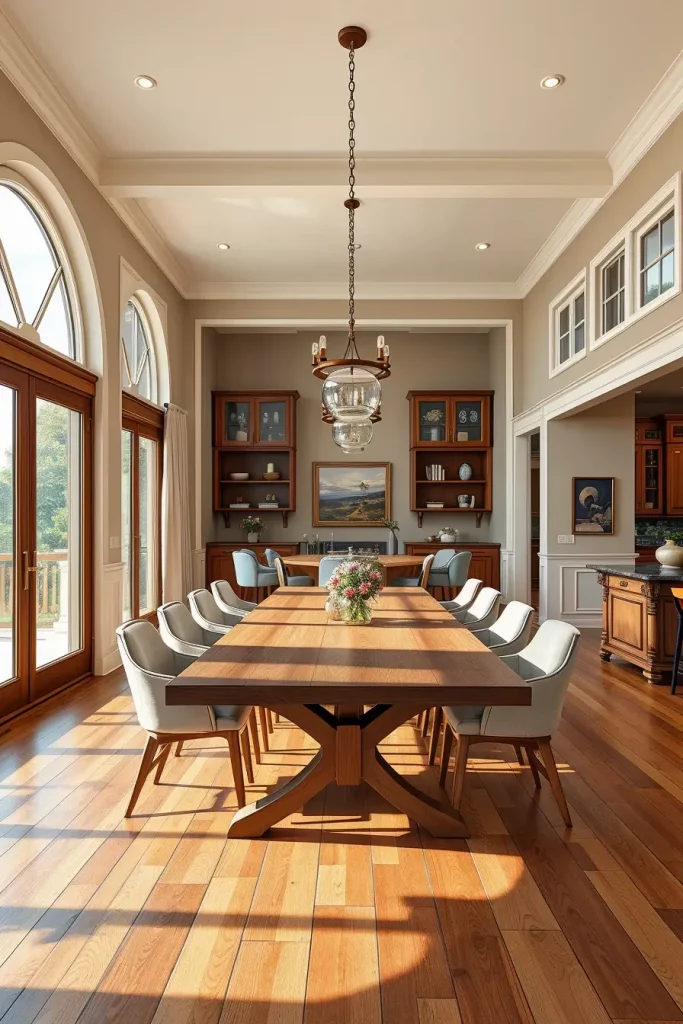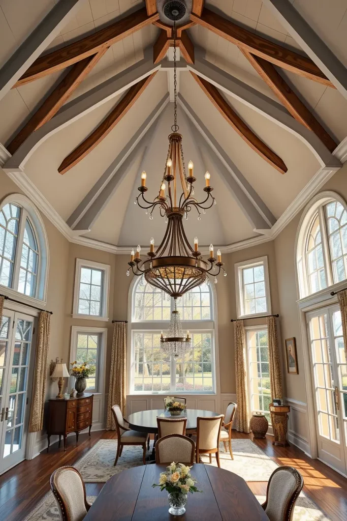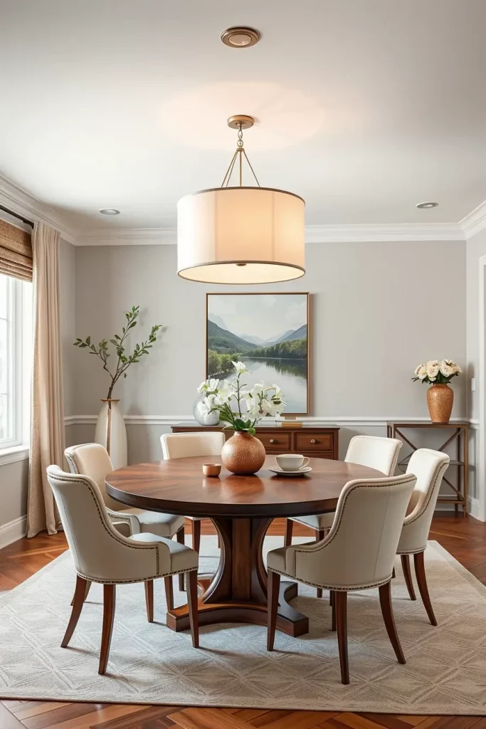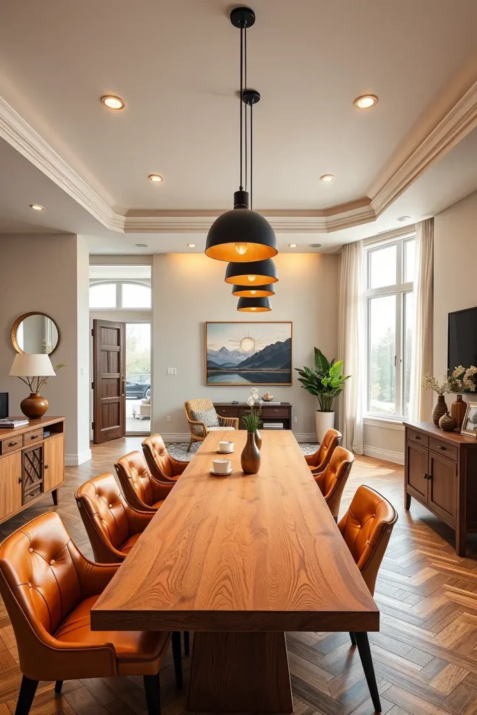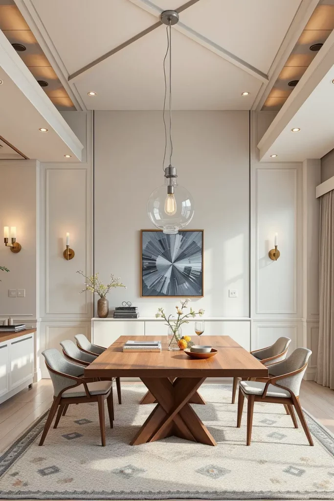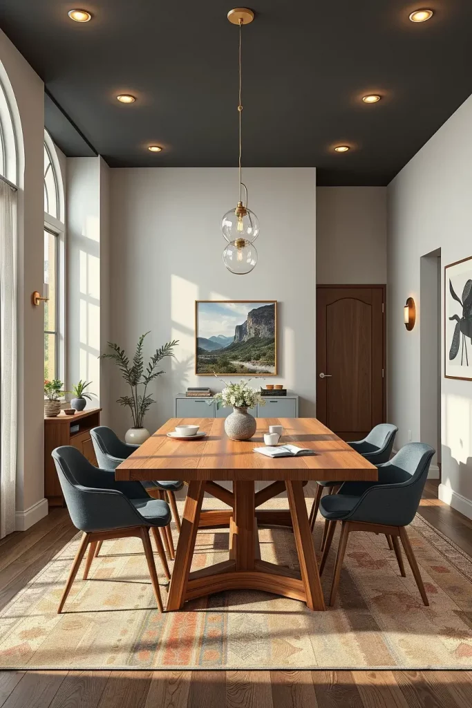 A two-tiered chandelier with adjustable chain became the focal point of my 10-foot ceiling room. The fixture achieved proper visual balance without appearing too high above the table. Designers from HGTV suggest using lighting that extends vertically while preserving both sightlines and dialogue flow.