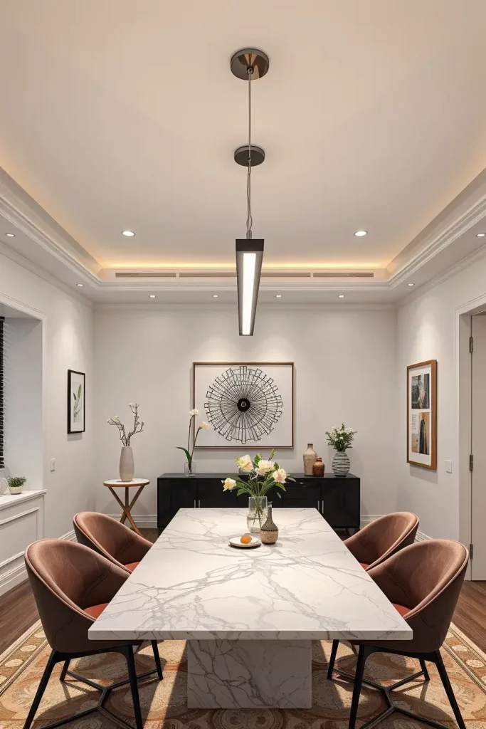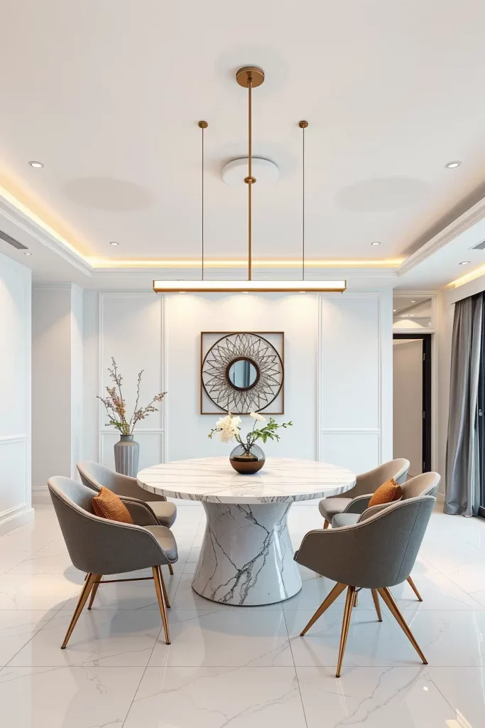 The distribution of light needs to be even and the illumination must be sufficient. I choose lighting fixtures with diffusers or open bottoms which prevent shadows from forming on plates. A decorative effect results from selecting materials such as glass, brass and marble alongside proper shapes. The installation of fixtures designed in the form of floating glass orbs or cascading rings automatically transforms the room into an elegant space.
