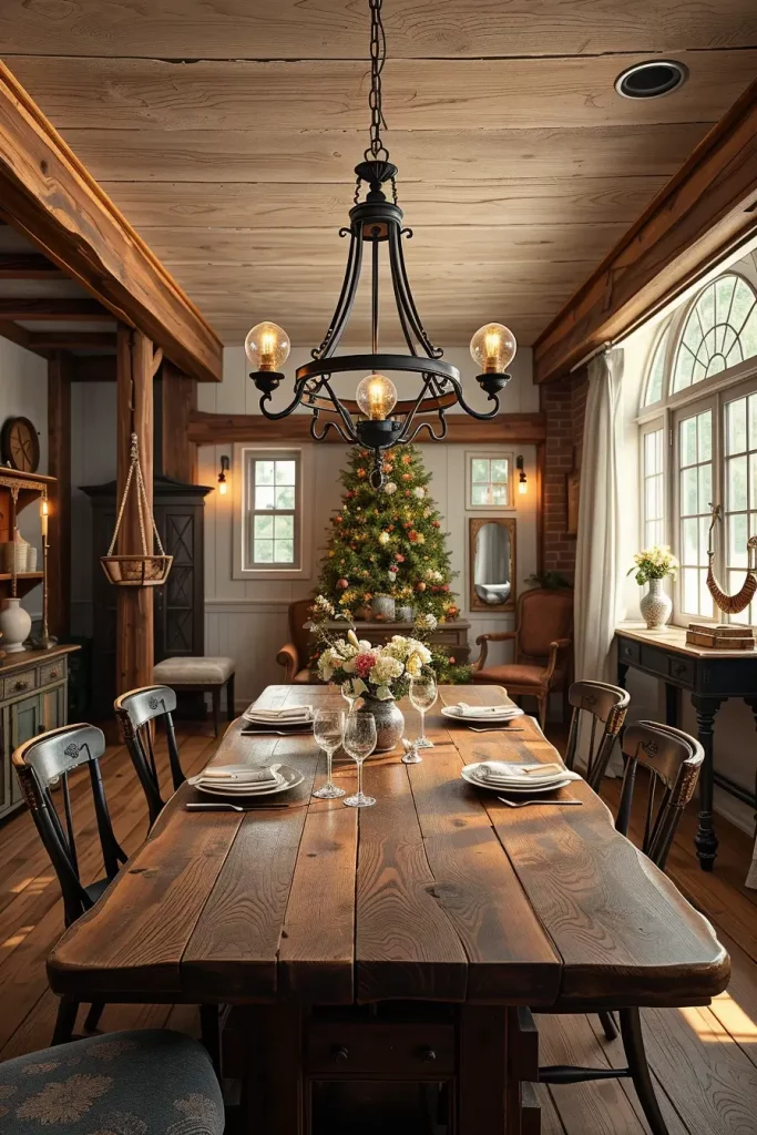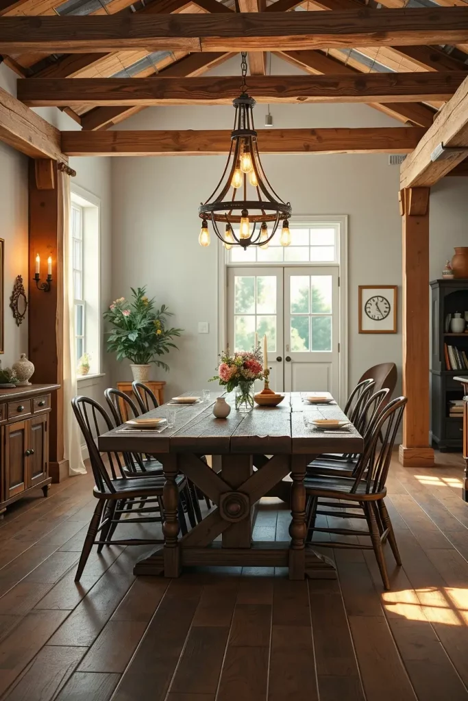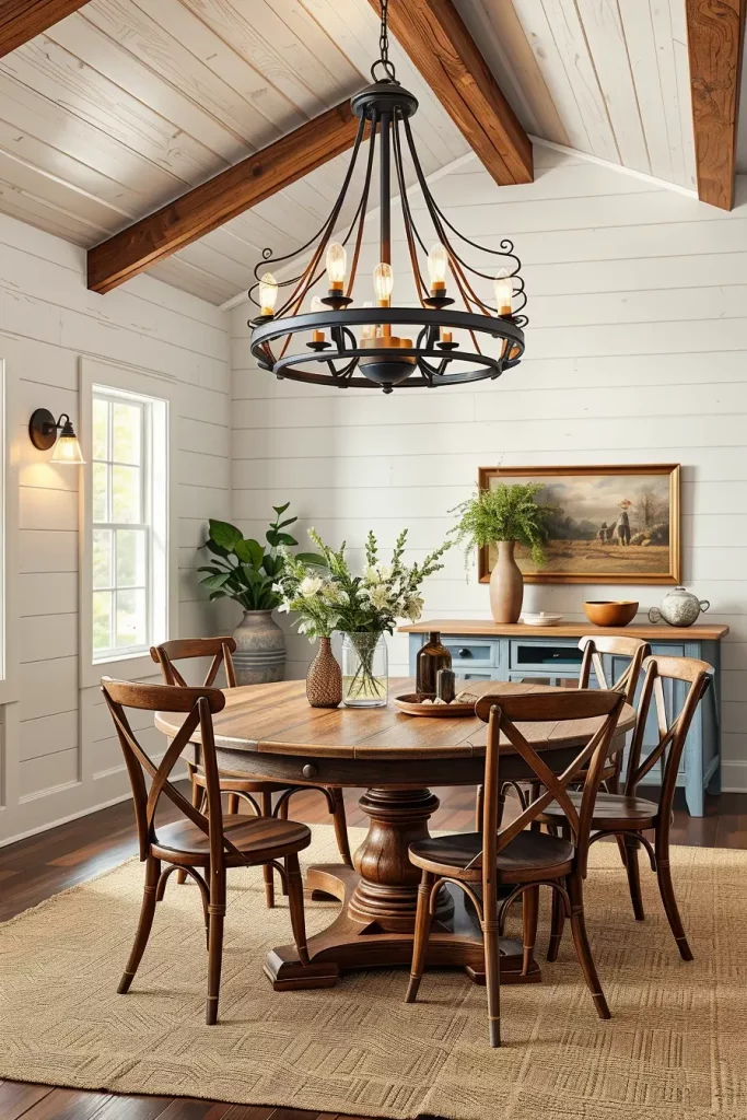 I focus on finding authentic elements when designing rustic dining areas. A rustic setting should incorporate natural materials that include wood and wrought iron and aged metal elements. The raw charm of the space requires lighting fixtures that should include hanging lanterns or reclaimed wood chandeliers. These fixtures work perfectly with both exposed beams and farmhouse-style wood tables. Warm-toned bulbs combined with dimmers create the perfect country atmosphere to enhance family dinners or evening meals.