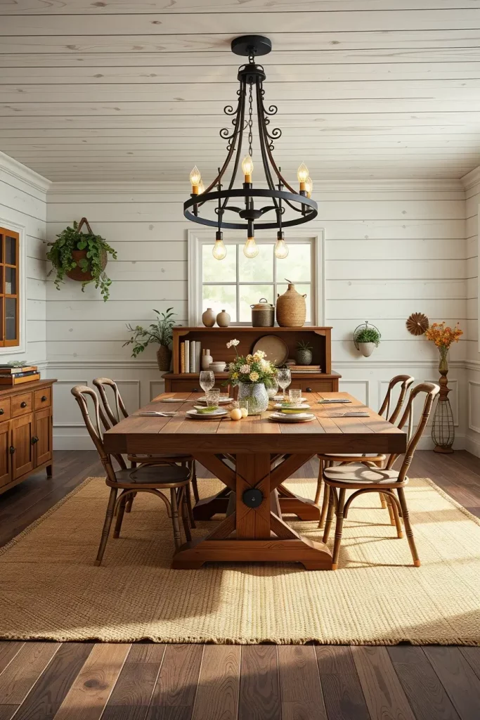 A wood-and-metal rectangular chandelier with Edison bulbs would hang above a table made from reclaimed wood. Cross-back chairs and shiplap walls and jute rug create a lived-in atmosphere that extends from the walls to the floor. The lighting flexibility is maintained through my usage of dimmable bulbs.