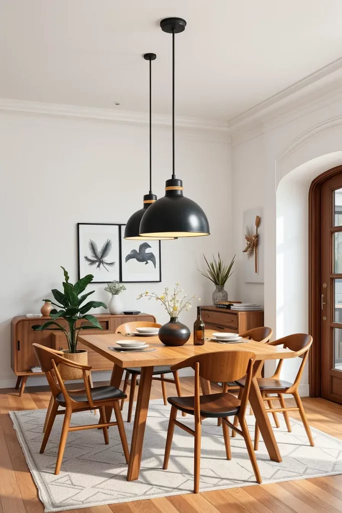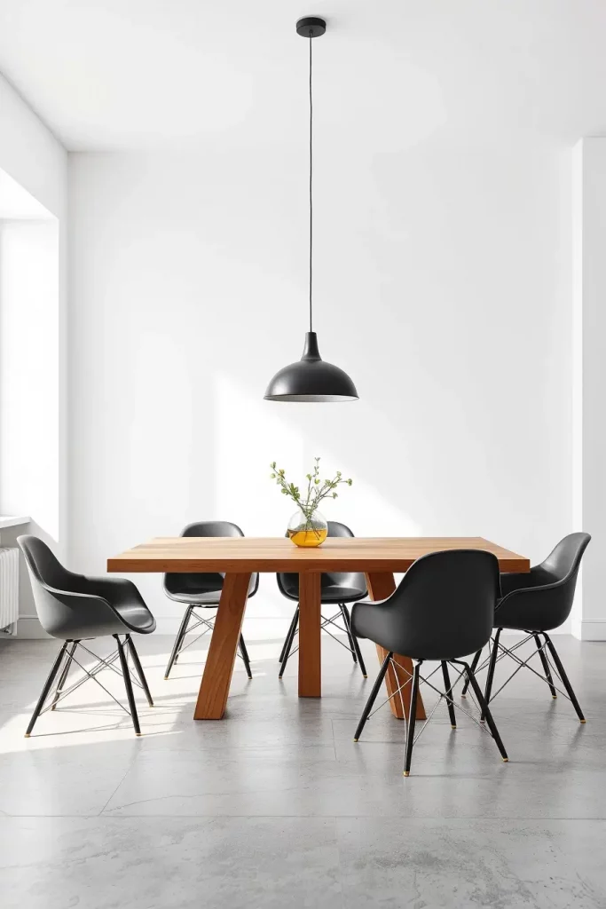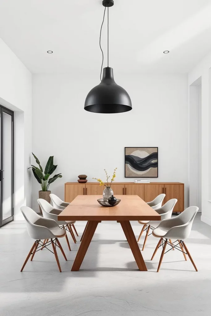 I prefer to install two or three pendant lights which should be distributed evenly above the dinner table. Modern-industrial spaces often feature matte black pendants with brass interiors while minimalist interiors benefit from frosted glass or globe fixtures. I match the pendant hardware to other room accents made from wood or tan leather when my clients own wooden dining tables.