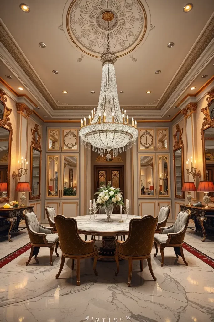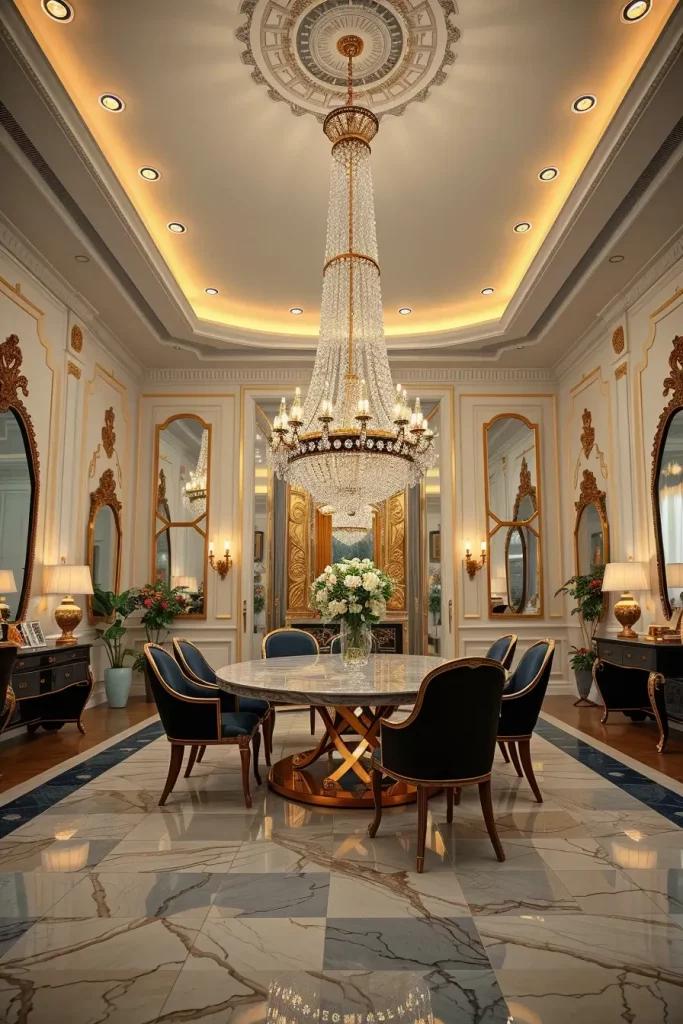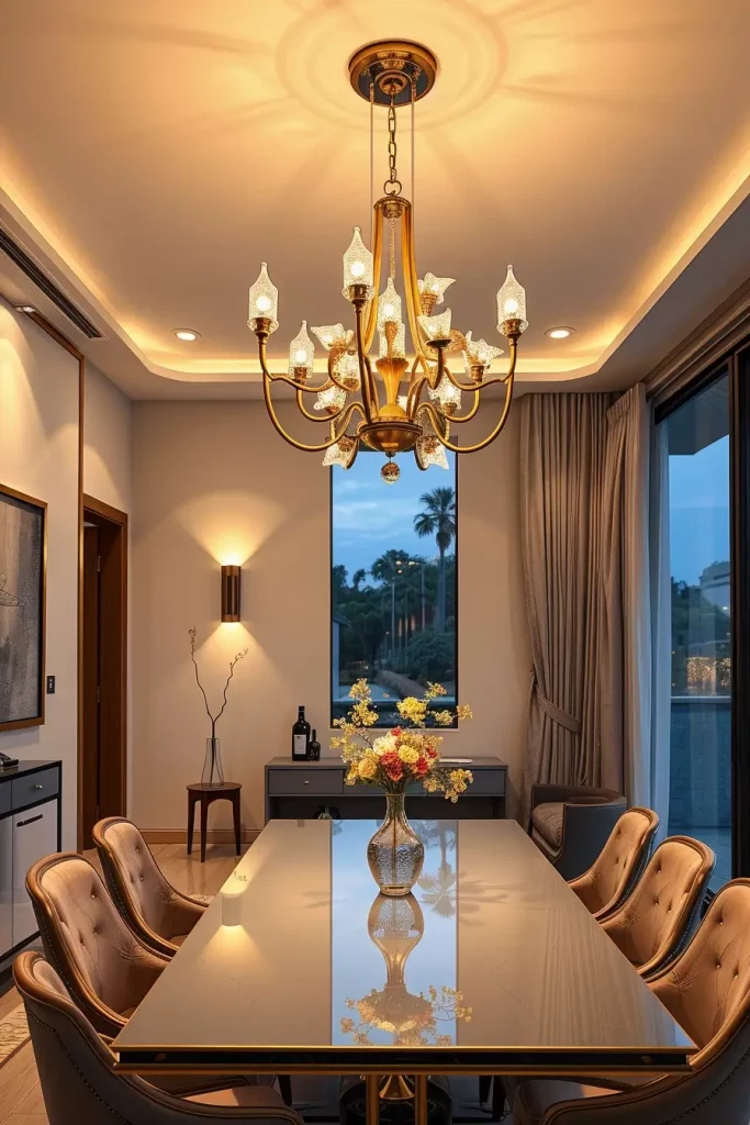 Chandeliers come in various forms including crystal cascades and multi-tiered glass rods with gold-finished sculptural designs. A Murano glass chandelier installed over a marble dining table added glamour to the space without becoming overwhelming. The chandelier’s image on the table surface added to the luxurious atmosphere.