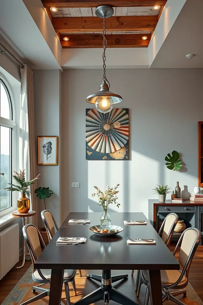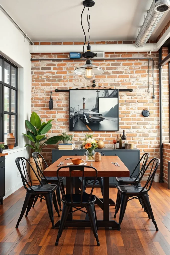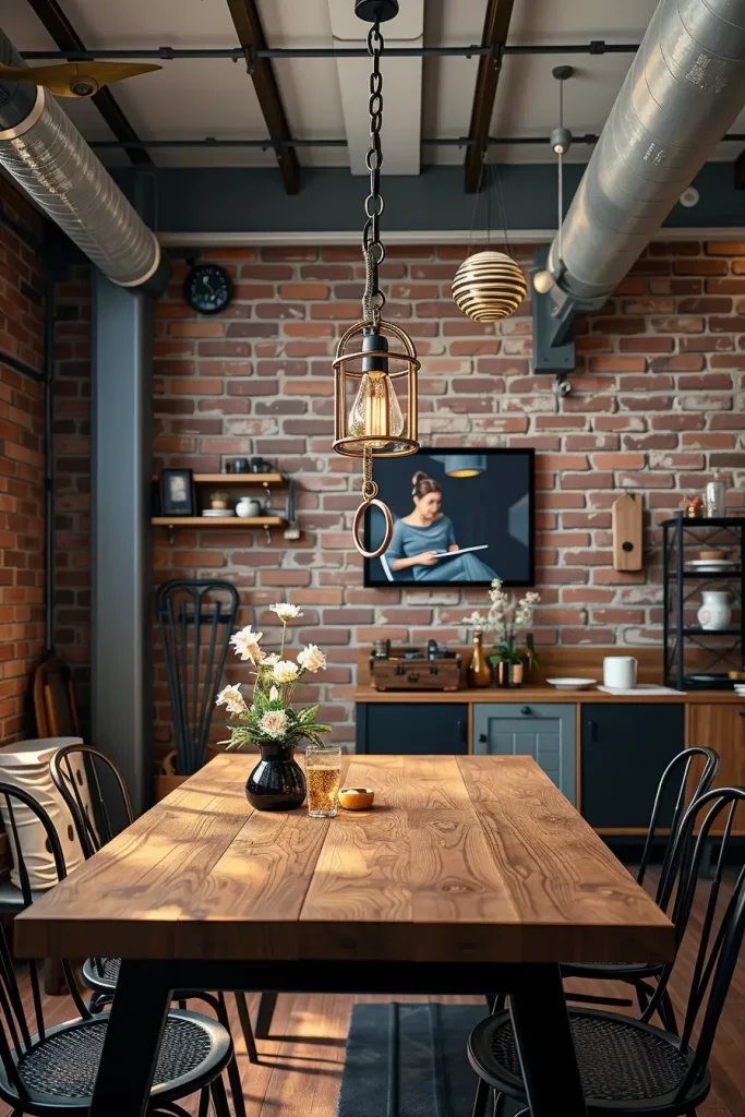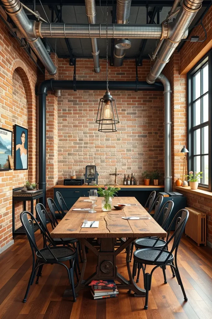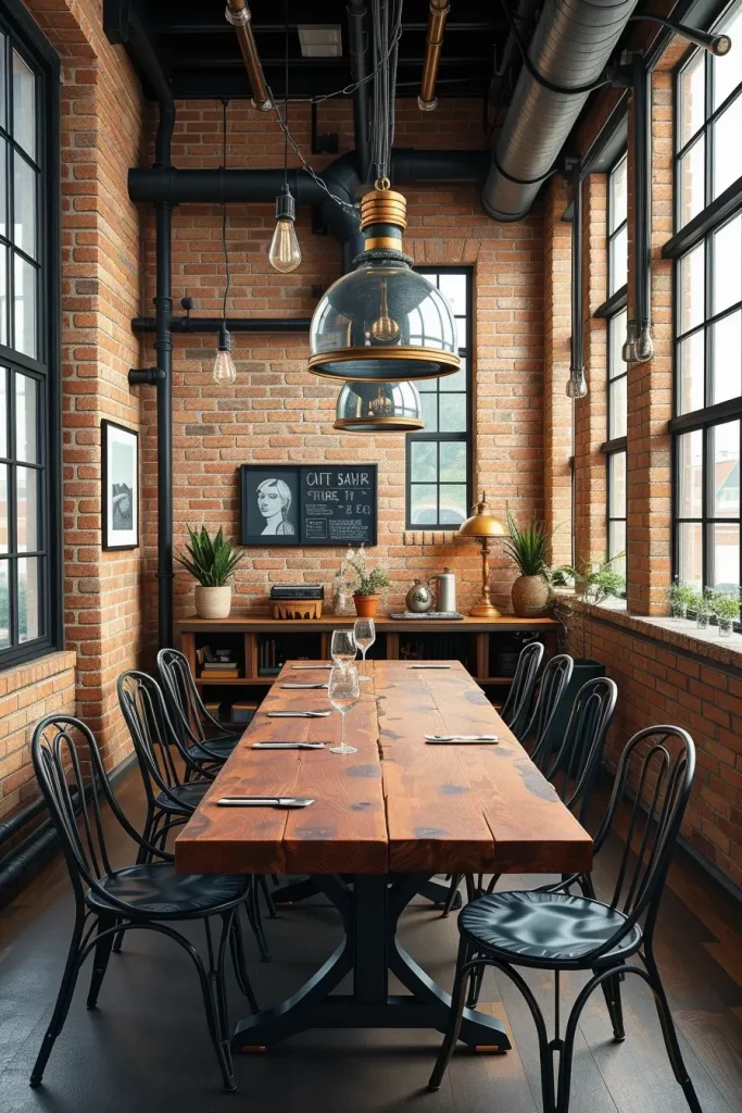 Dining furniture needs to match the industrial character of the lighting by using metal-framed chairs with a concrete or reclaimed wood table and possibly exposed brick walls. Minimal decorative elements should be used because they allow structural elements and forms to remain the focal point. A statement lighting fixture serves as an anchor to unify the entire theme without taking over the space.