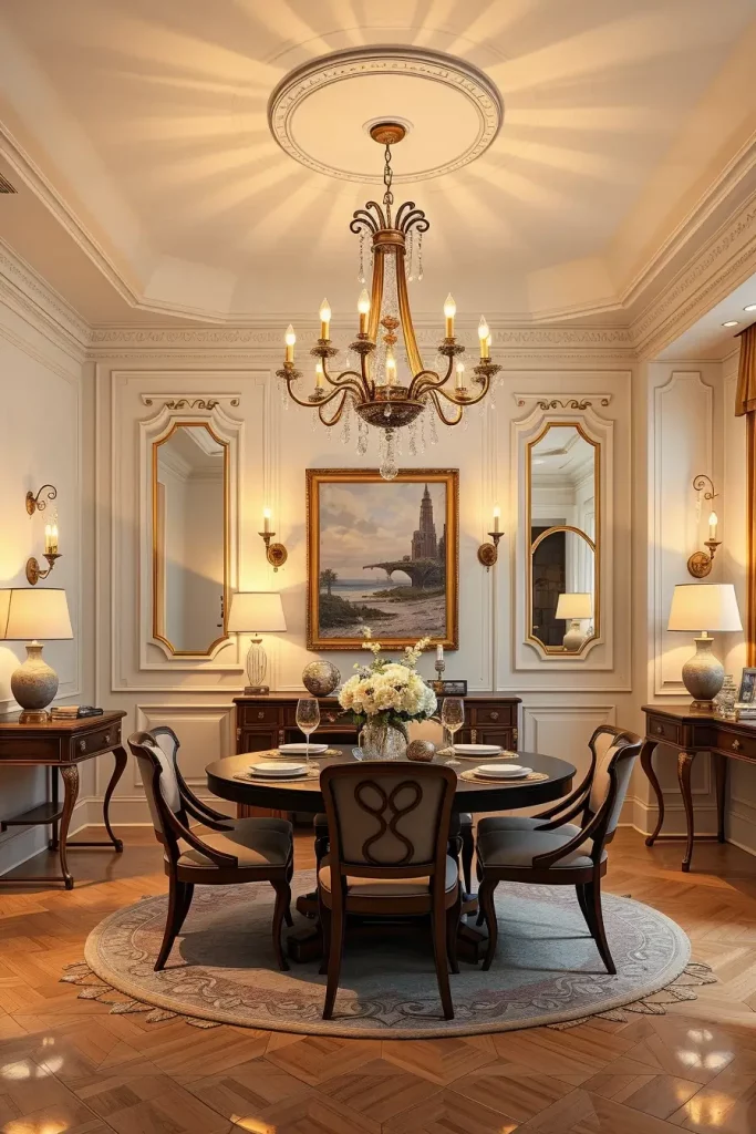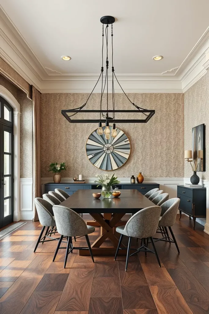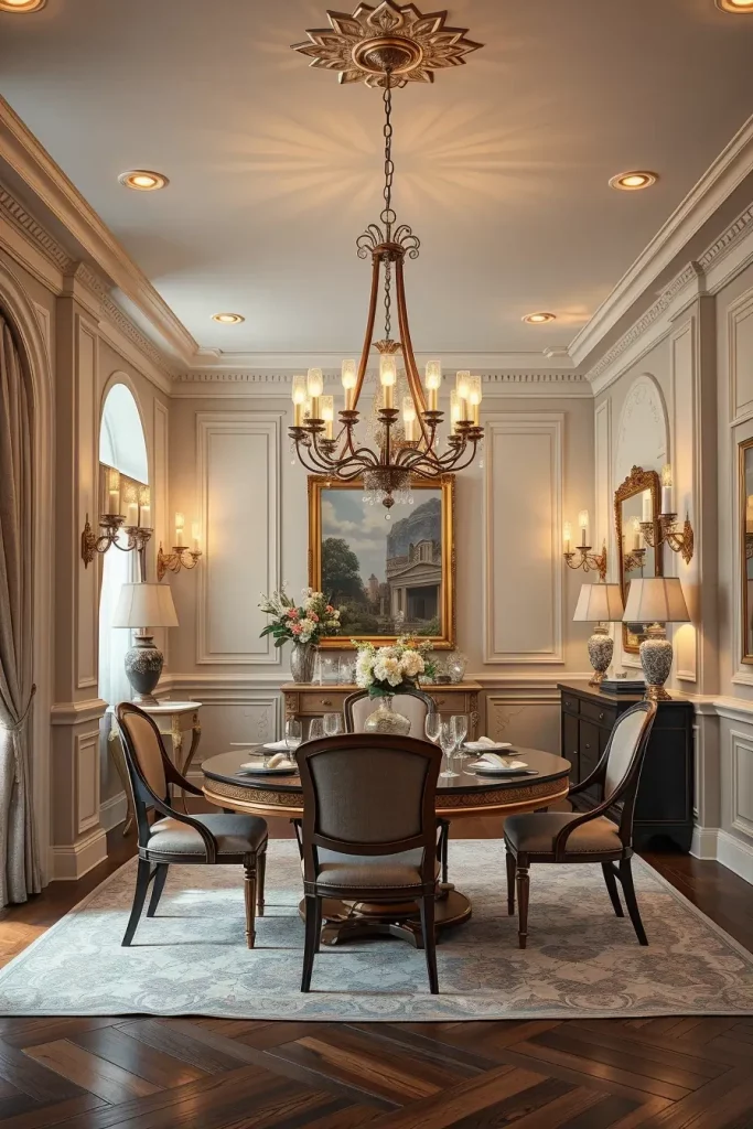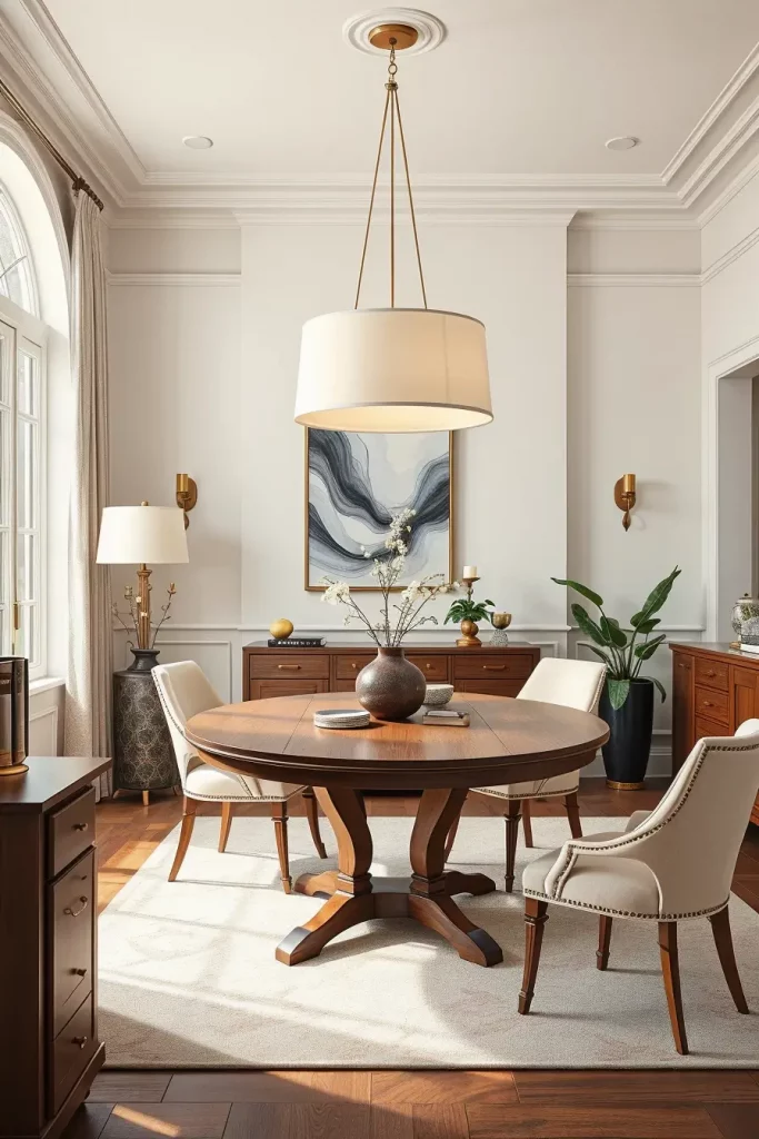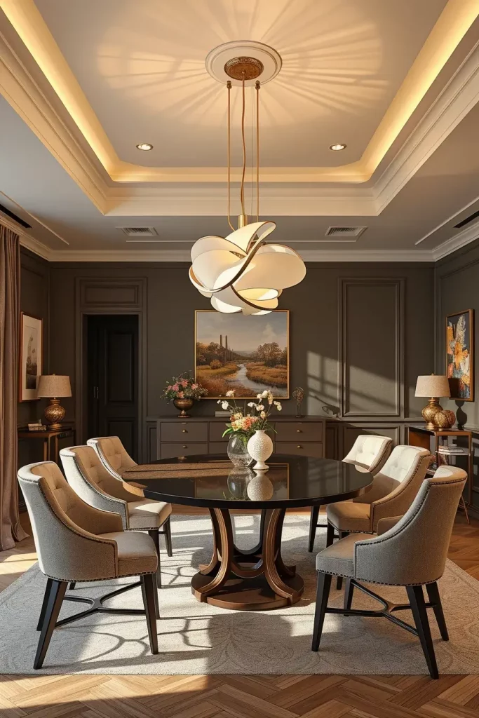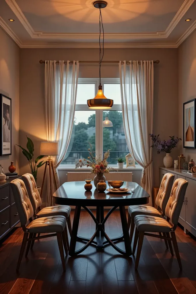 The room’s atmosphere requires furniture pieces which match its tone through the use of tufted upholstered chairs and polished mahogany tables and fine china displayed in nearby hutch. I enhance the luxurious feel by using silk or velvet drapes alongside these fixtures. The best lighting position for a dining table is straight above its center point while using downward-facing bulbs with diffusing shades.