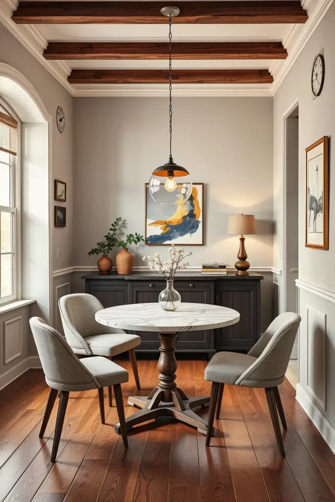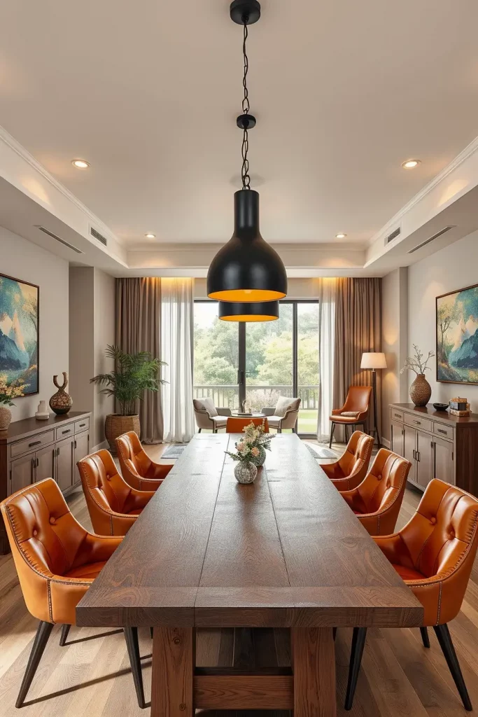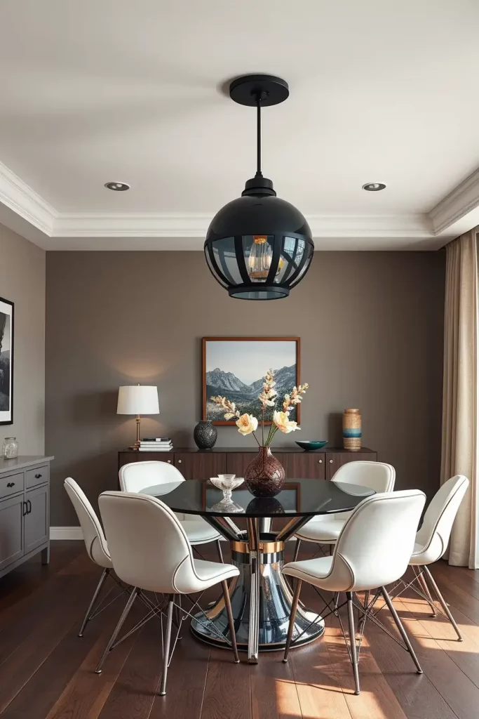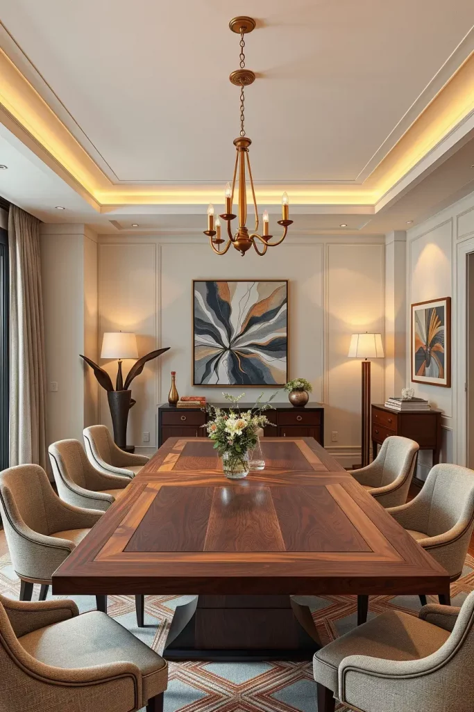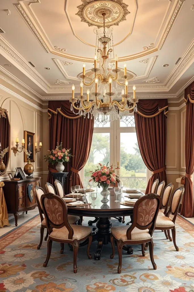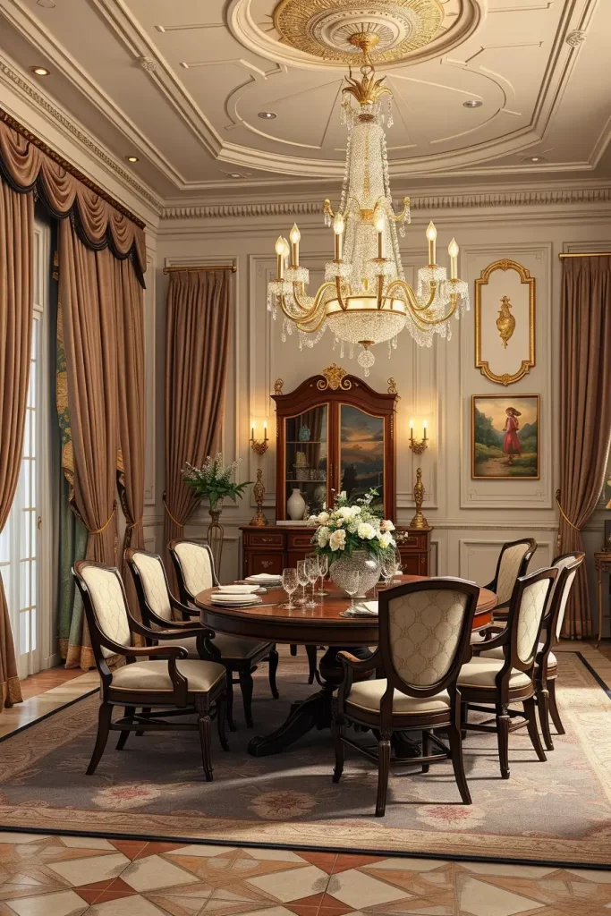 The room’s atmosphere requires furniture pieces which match its tone through the use of tufted upholstered chairs and polished mahogany tables and fine china displayed in nearby hutch. I enhance the luxurious feel by using silk or velvet drapes alongside these fixtures. The best lighting position for a dining table is straight above its center point while using downward-facing bulbs with diffusing shades.