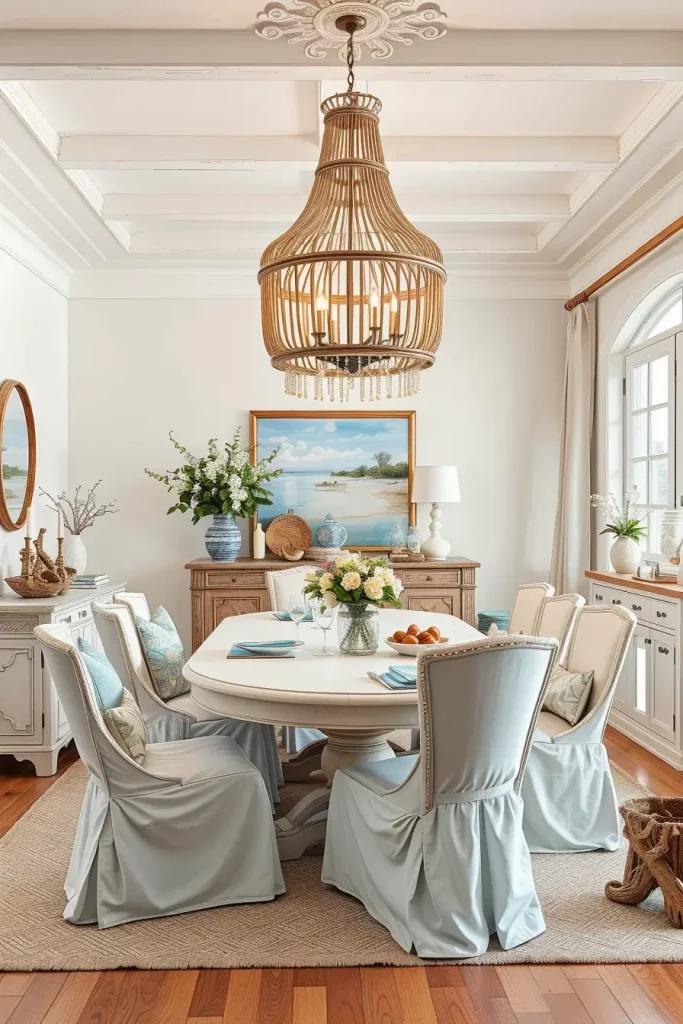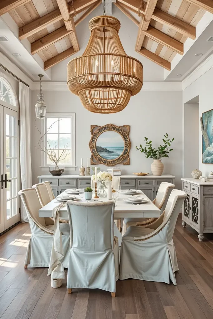 I installed a beaded chandelier above a beach-house table which produced beautiful light and shadow effects. According to Coastal Living natural fiber fixtures create an authentic beachside atmosphere.