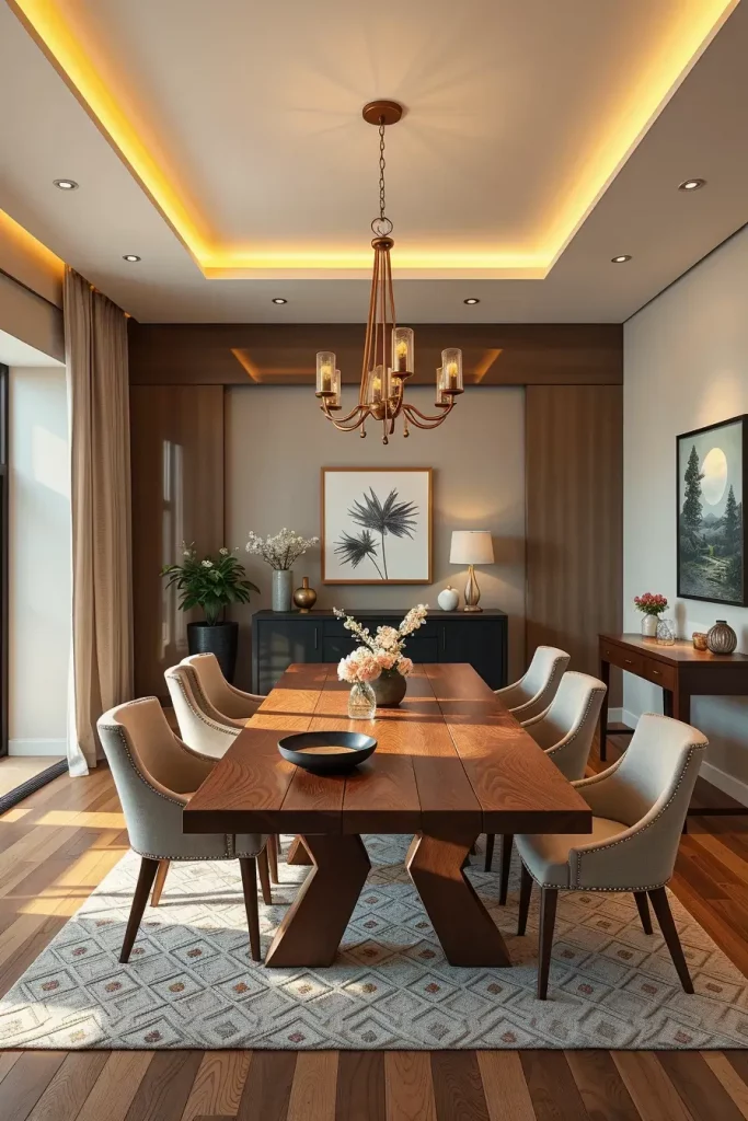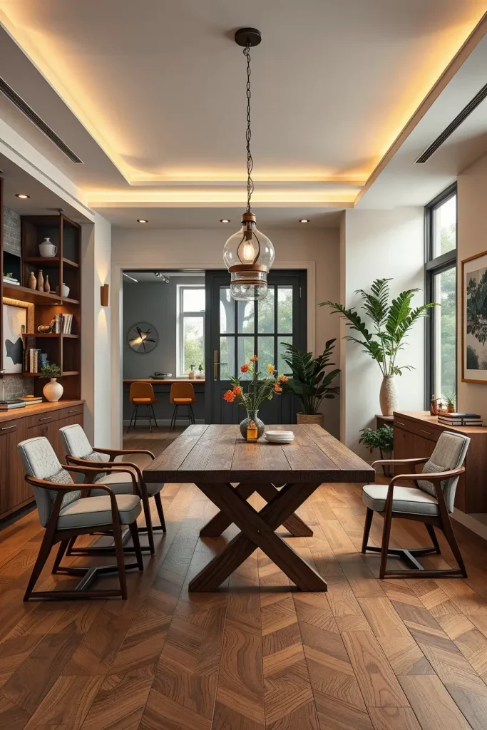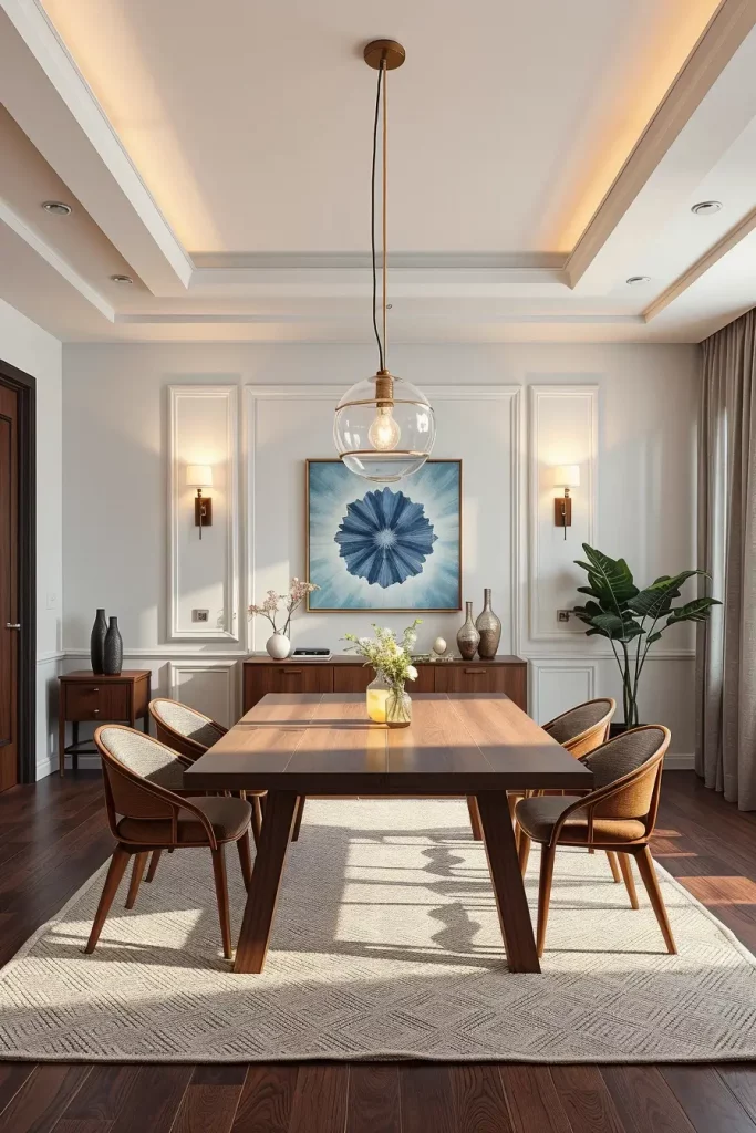 A single lighting fixture cannot fulfill every lighting requirement. I select statement chandeliers or linear pendants for transitional dining rooms with wooden floors and rectangular tables. A lighting fixture should sit directly above the table surface while maintaining a balance with the furniture beneath. The material selection between glass, metal or fabric shades determines the amount of light diffusion in any space.