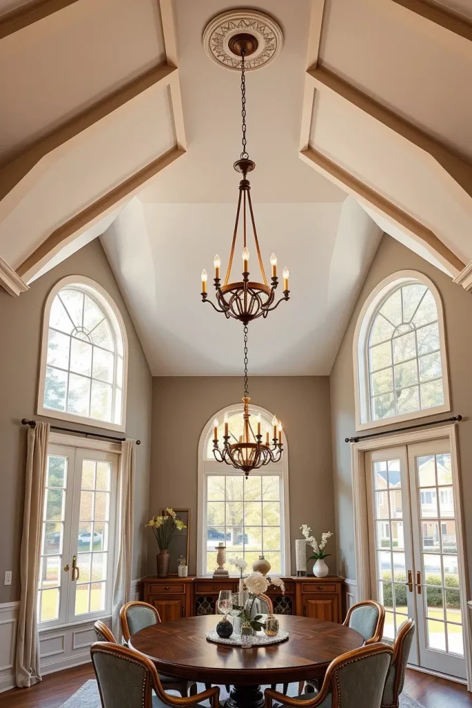 When you have vaulted or cathedral ceilings I prefer to use extended downrods or adjustable chains which let you position the light fixture at eye level. The room benefits from vertical scale fixtures such as tiered chandeliers or tall pendants. Semi-flush and flush mount fixtures work best for rooms with lower ceilings to avoid creating a cramped atmosphere.