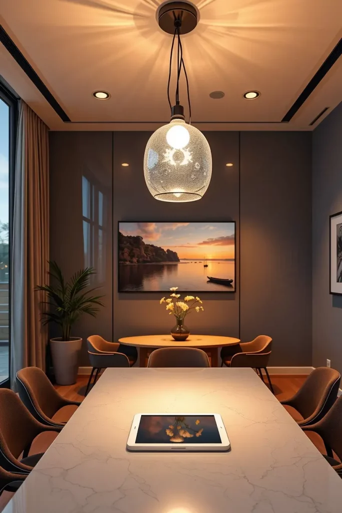 Design cohesion requires me to select fixtures that hide smart bulbs from view. A contemporary pendant equipped with frosted glass both conceals the bulb and enables users to control the full spectrum. The functionality suits households that combine their dining area for social gatherings and academic work.