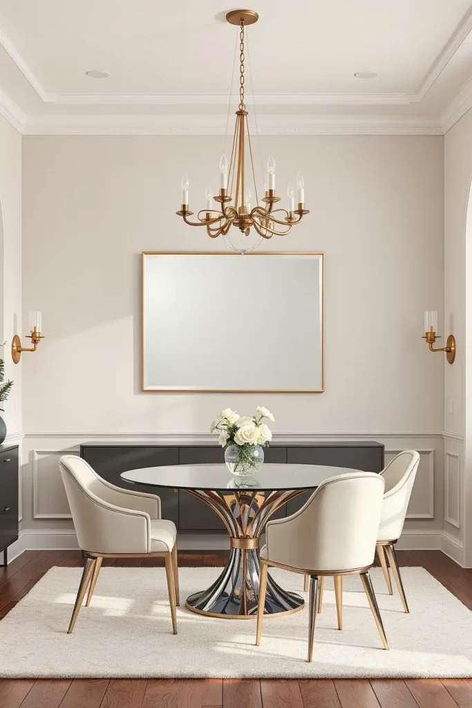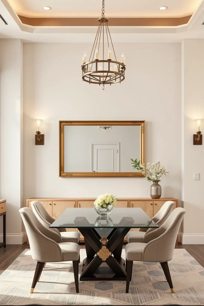 I suggest finishing this look with mirrored candleholders or glass vases on the table. These compact reflective surfaces extend the lighting effects to create a curated and harmonious dining area. A wall-mounted sconce with a glass shade positioned near the mirror will create a visual frame that enhances the entire design.
