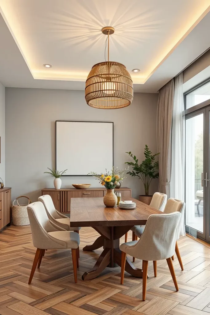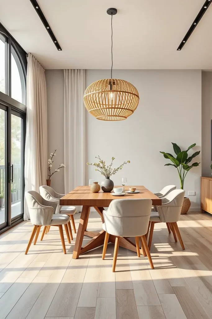 My choice of fixtures rests on materials sourced from bamboo together with linen and rattan and other natural and recycled elements. A bamboo drum pendant hanging above the dining table presents an organic appearance which is also refined. Drum shades with linen fabric create a gentle illumination that harmonizes with both Scandinavian and Japandi dining rooms. I verify that the electrical components work with low-wattage LED bulbs and smart bulbs which can be controlled through mobile applications.