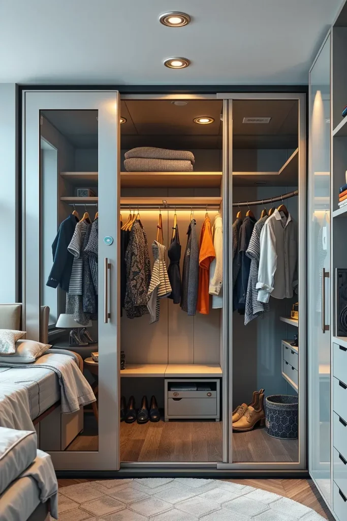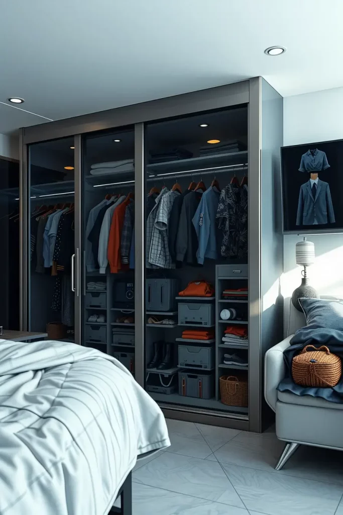 The wardrobe design is vertically slim and usually has a matte metal surface and sliding doors made of glass. RFID scanning and garment weight detection are featured on each hanger base inside. The intelligent system monitors wear cycles, recommends matches and even has the ability to book laundry times at communal dormitories. It usually has an in-built dehumidifier and sterilizer to preserve the freshness of clothes.
