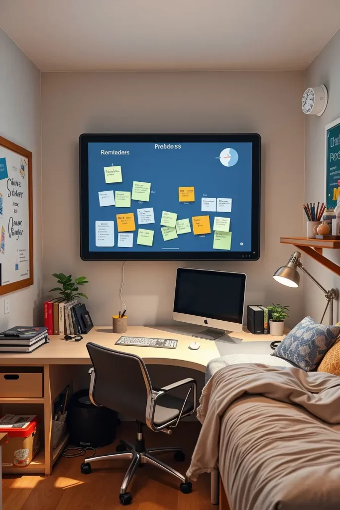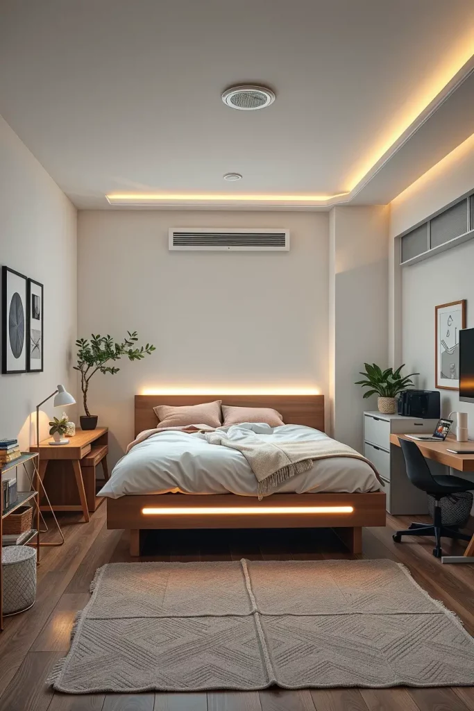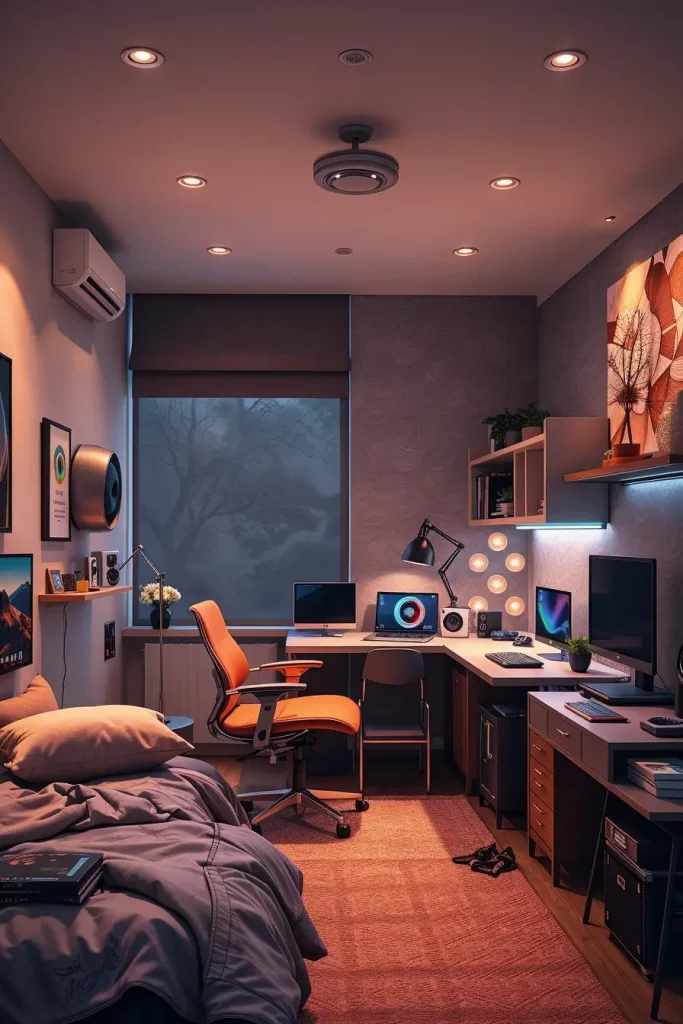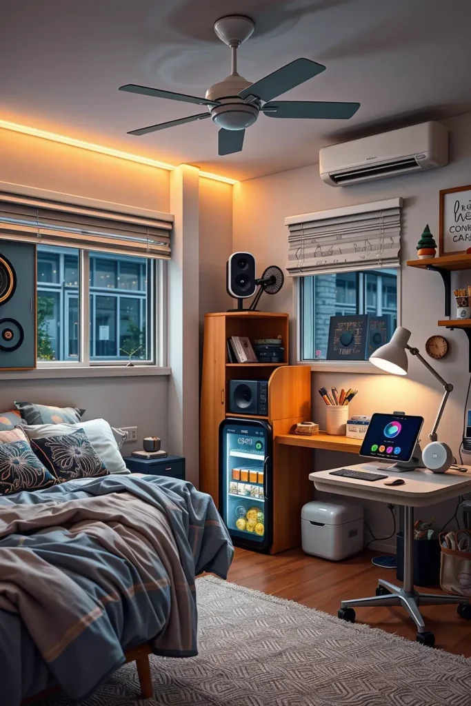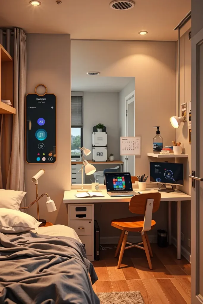 The AI in my dorm ideas is contained in either a central smart hub or a mirror-embedded screen. It can follow voice commands, integrate with class schedules, recommend studying sessions and even change the lighting depending on the focusing requirements. I also involve desk arrangements that enable students to communicate without using their hands (voice or gesture).