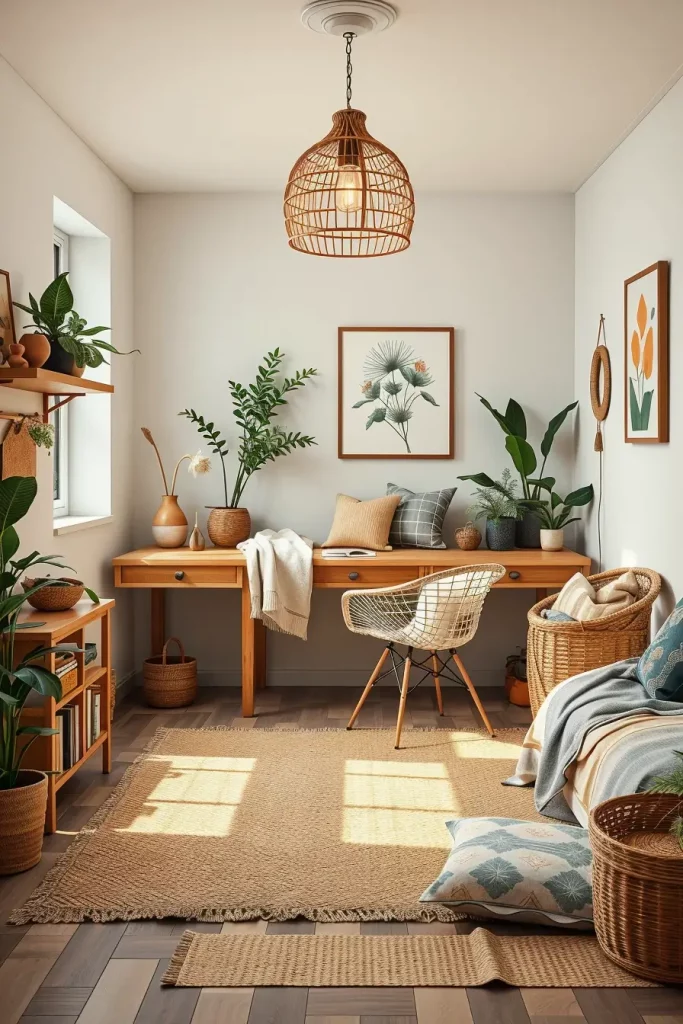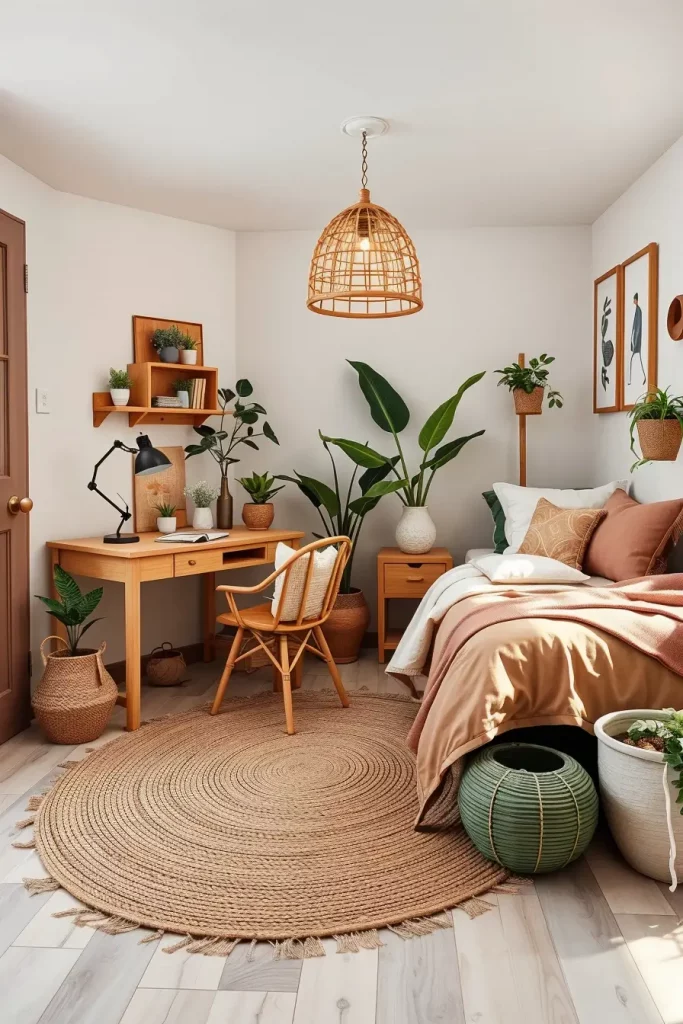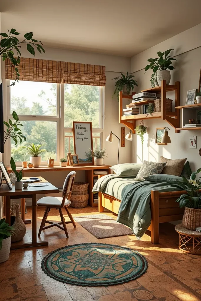 Jute rugs, rattan lighting, bamboo wall hooks, and recycled plastic chairs that are equally as sleek as their non-sustainable versions are also common in my eco-forward dorm designs. I prefer organic cotton or linen bedding in soft soothing colors. Greenery—real or faux—adds a natural layer that elevates the decor while purifying air (if live). To add an additional effect, I use wall decals that are created using biodegradable materials.