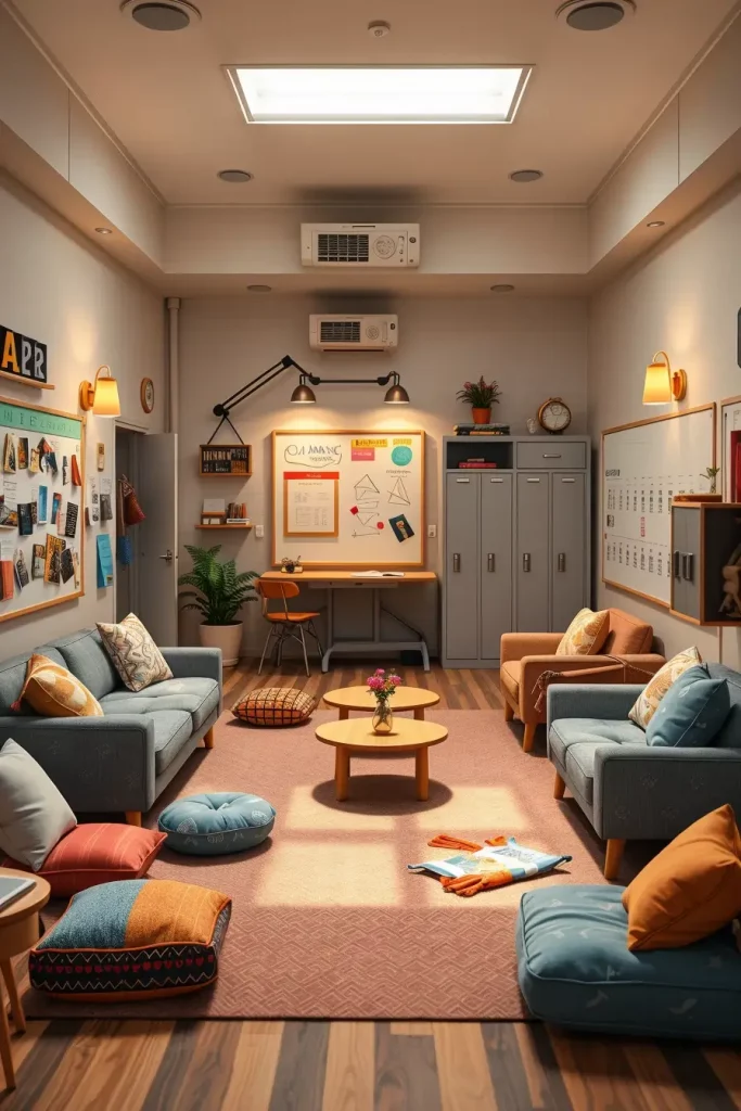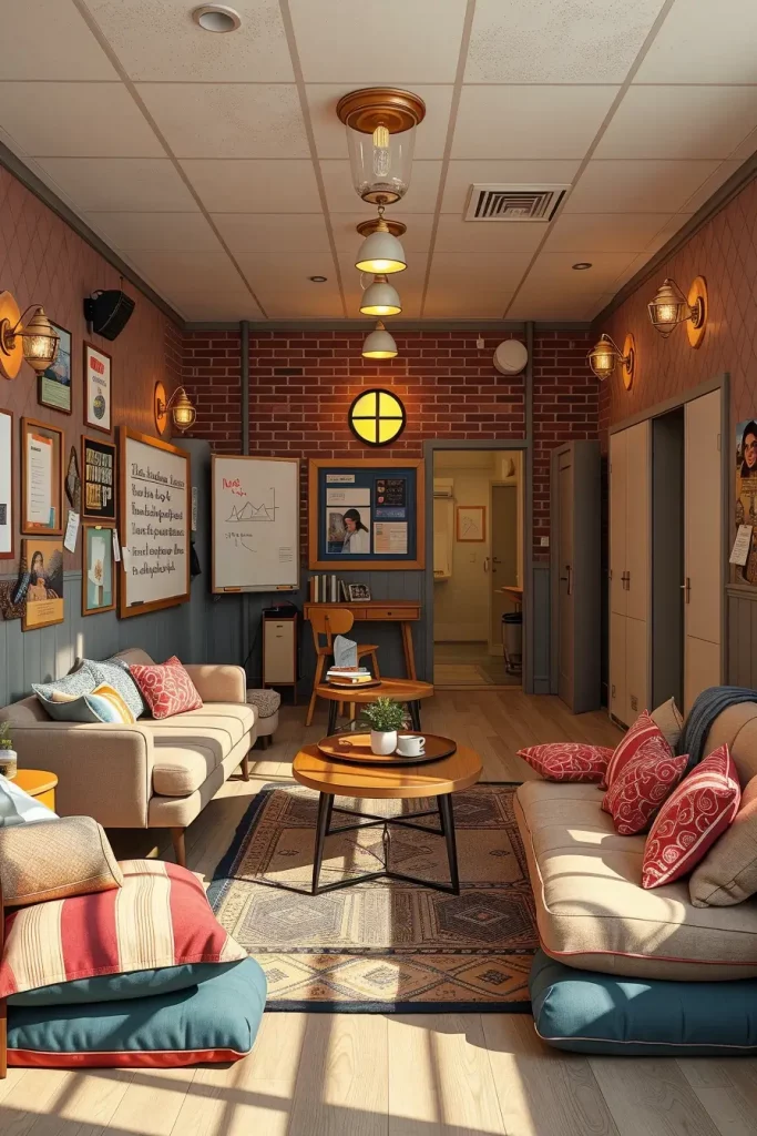 The trick is to involve students in all design decisions. Imagine flexible seating areas using floor cushions, low modular couches and fold up tables. Walls are covered with magnetic whiteboards, AR-powered community boards, or even lockers that can be rented to keep art supplies or cooking equipment. I do notice layered lighting a lot: soft warm sconces to use in the evenings and more ceiling lights to use when having a game night or studying group. The furniture is relaxed but durable, such as extra-large beanbag chairs with high-top counters as social study areas.